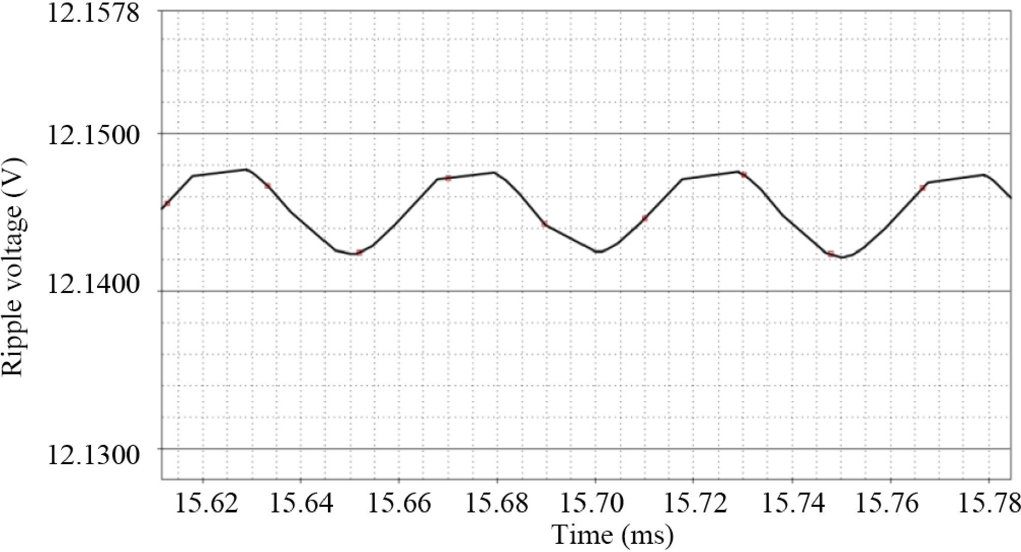 Figure 13 shows the output voltage ripple, clearly indicating that the output ripple is less than 120 mV. The observed output voltage ripple, while slightly higher than conventional designs, is a direct result of prioritizing intrinsic safety in compliance with GB/T 3836.1-2021. This trade-off ensures robust operation in hazardous environments, with ripple levels well within the permissible range defined by the standard.