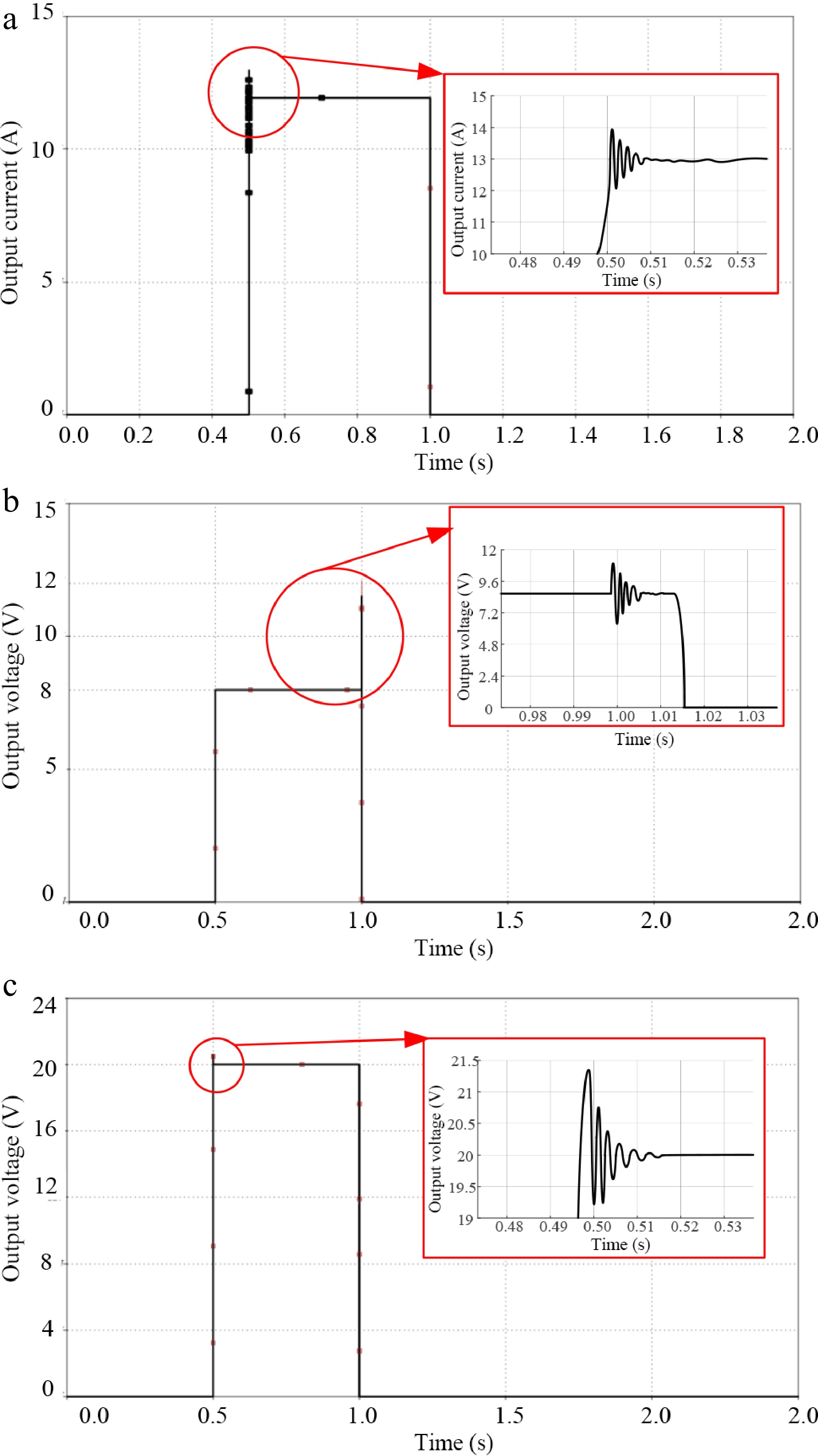To clearly illustrate the dynamic response of the overcurrent protection circuit, magnified waveforms of the transient period are provided in Fig. 14a–c, showing the behavior before and after the protection is triggered.