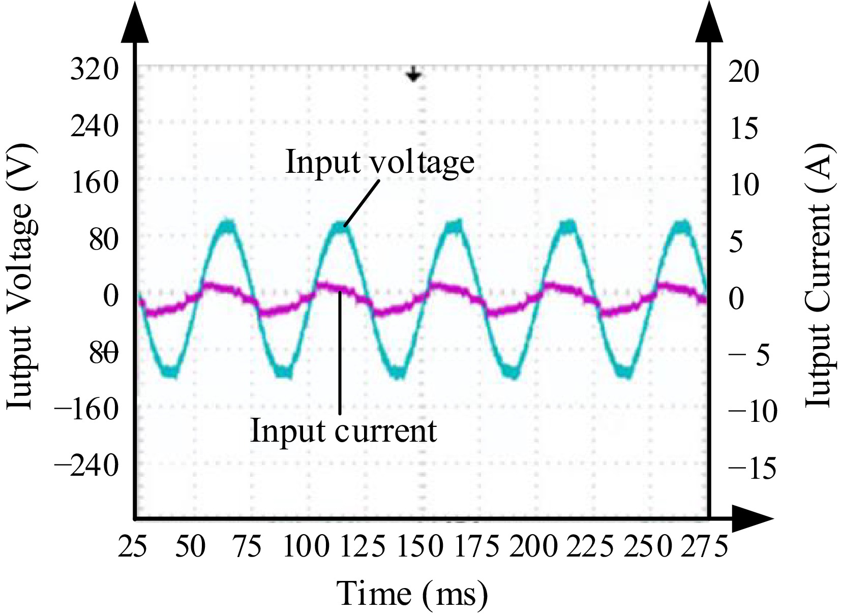 As shown in Fig. 11, a CLC filter is incorporated at the input stage to enhance ripple suppression, extend capacitor lifespan, and improve system safety. The inclusion of this filter results in a smoother, sine-like input voltage waveform. To prevent a short circuit, a 0.01 Ω resistor was added in series with the pure inductor model in PSPICE. The parameters for the circuit are: a switching frequency of 20 kHz, and CLC filter parameters of C1 = 47 μF, C2 = 4.7 μF, and L3 = 1 mH. The simulation results are shown in Fig. 12.
