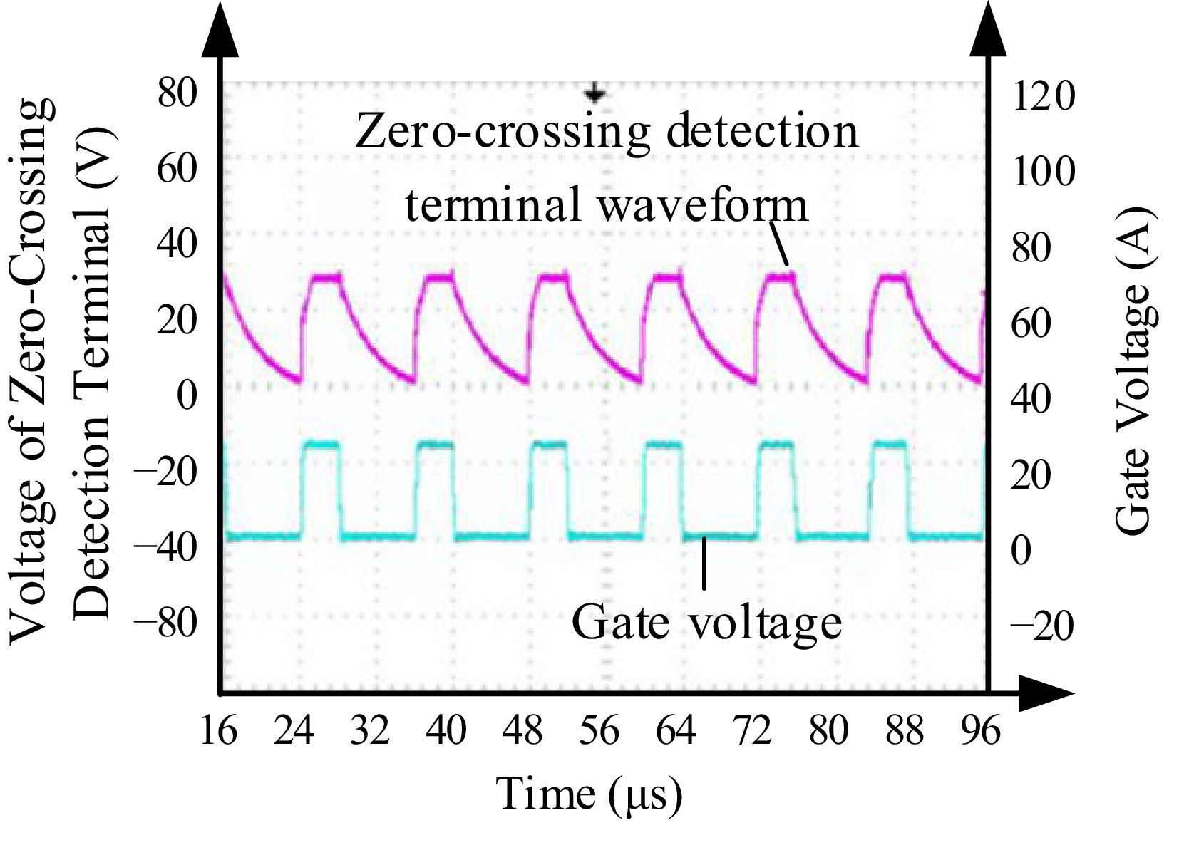 Parameter Value Parameter Value Vinmax 150 V R4 5 kΩ IBF 0.14 A R5 and R6 1 kΩ UDS 200 V R7 10 kΩ ID 6 A R8 1.3 kΩ Ui 20 V R9 3.3 kΩ Uo 12 V R10 1 kΩ Dmax 0.545 R11 0.7 kΩ R1 9.7 kΩ R12 10 kΩ R2 1 kΩ R13 1 kΩ R3 1.3 kΩ Cp 1 μF La and Lp 61.89 μH Cs 0.25 μF Ls 247.56 μH C1 47 μF L3 1 mH C2 4.7 μF C3 0.25 μF C4 200 μF The input voltage and current waveforms during system operation are shown in Fig. 16, where the blue line represents the input voltage waveform and the purple line represents the input current waveform. The current waveform closely follows the voltage waveform, essentially meeting the design requirements. Figure 17 shows the gate voltage of the main switching transistor and the zero-crossing detection terminal waveform. From the figure, it can be seen that the system's off-time is 8 µs, which is consistent with the practical application background in coal mines.
