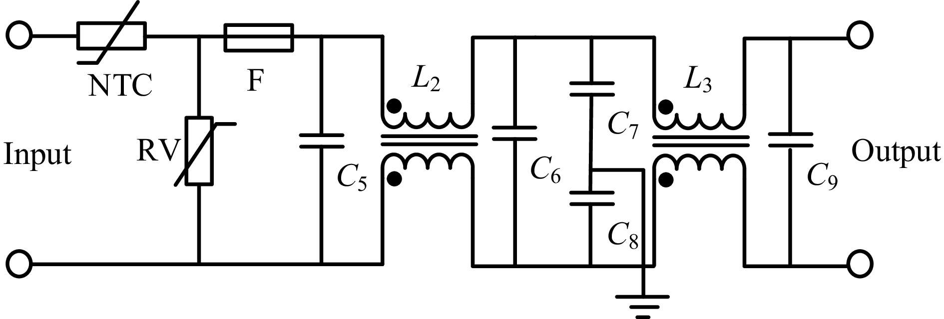 Following the protection circuit are common-mode chokes (L2, L3) and filter capacitors (C5−C9). The two coils of L2 have the same magnetic flux direction. When common-mode interference occurs, the total inductance of L2 increases rapidly, greatly obstructing the common-mode signals. The selection of L2's inductance depends on the rated current of the circuit. Under the same frequency and voltage drop, the larger the current, the smaller the required inductance. The capacitors (C5−C9) are safety capacitors, which are generally used in anti-interference filter circuits and will not fail by breakdown. Safety capacitors are divided into X and Y types. X-type safety capacitors are connected between the live wire and the neutral wire. In this EMI filter circuit, C5, C6, and C9 are all X-type safety capacitors, with capacities ranging from 0.01 to 0.47 μF, filtering differential mode interference. C7 and C8 are connected between the live wire and the ground wire and the neutral wire and the ground wire, respectively. They are Y-type safety capacitors with capacities ranging from 2,200 pF to 0.1 μF, suppressing common-mode interference. This system's filter circuit adopts more effective two-stage filtering.