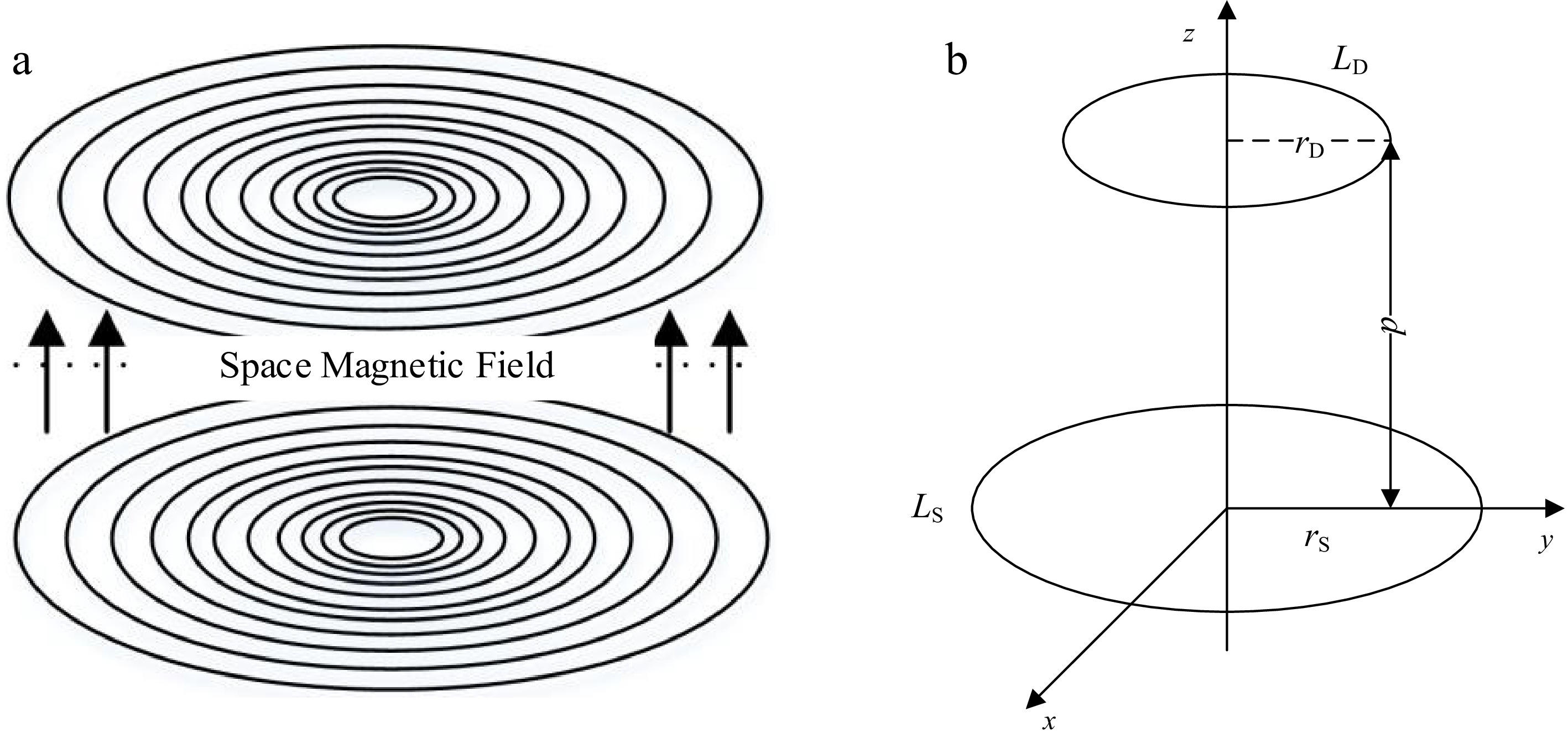 $ M = {\mu _0}\dfrac{{\sqrt {{r_{\text{D}}}{r_{\text{S}}}} }}{b}{n_0}{n_1}\left[ {\left( {2 - {b^2}} \right)K\left( b \right) - 2E\left( b \right)} \right] $ (7) $ b = \sqrt {\dfrac{{4{r_{\text{D}}}{r_{\text{S}}}}}{{{{\left( {{r_{\text{D}}} + {r_{\text{S}}}} \right)}^2} + {d^2}}}} $ (8) where, rS represents the radius of the transmitting coil, rD represents the radius of the receiving coil, n0 and n1 represent the number of turns of the transmitting and receiving coils respectively, d represents the distance between the coils, K(b) represents the complete elliptic integral of the first kind, and E(b) represents the complete elliptic integral of the second kind.