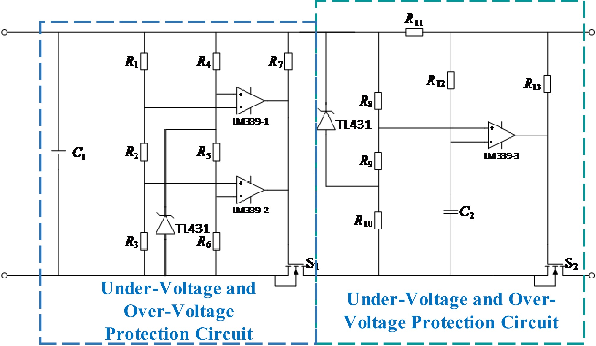 As shown in Fig. 5, the under-voltage and over-voltage protection circuit consists of over-voltage and under-voltage detection circuits and an action circuit, with the reference voltage provided by the TL431. The over-voltage protection reference voltage Vref1 is supplied by the TL431 to the non-inverting input of LM339-1, while the inverting input voltage V1 is derived from the voltage divider resistors R1 and R2 + R3: