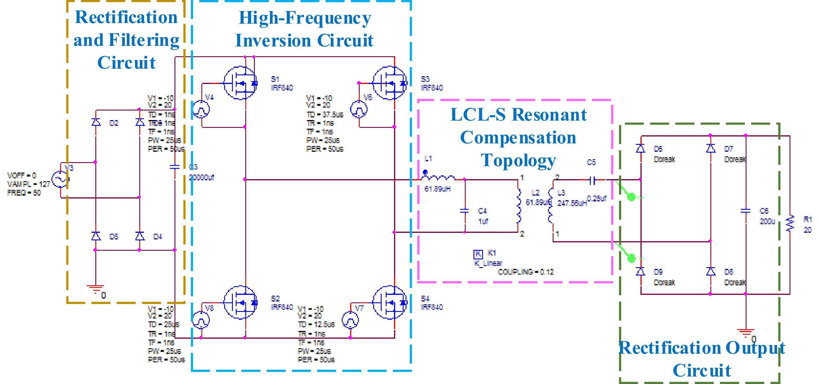 The LCL-S compensated topology ensures series resonance on the primary side and parallel resonance on the secondary side. This structure effectively decouples the resonant condition from the resistive load magnitude, allowing the system to maintain resonance even when the load power changes: