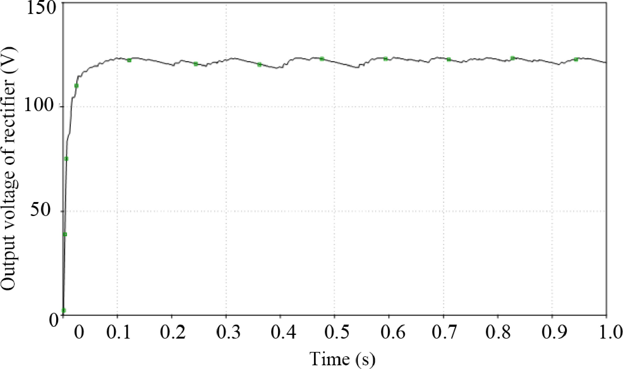 $ {V_{{\text{BF}}}} = 1.5 \times \left( {\sqrt 2 \times {V_{{\text{inmax}}}}} \right) $ (4) The voltage withstand value VBF of the rectifier module should be greater than 318 V. The maximum rated current of the rectifier module is determined by the system's maximum output power and the minimum input current. Considering a ± 15% voltage fluctuation, the minimum input voltage is 105 V.