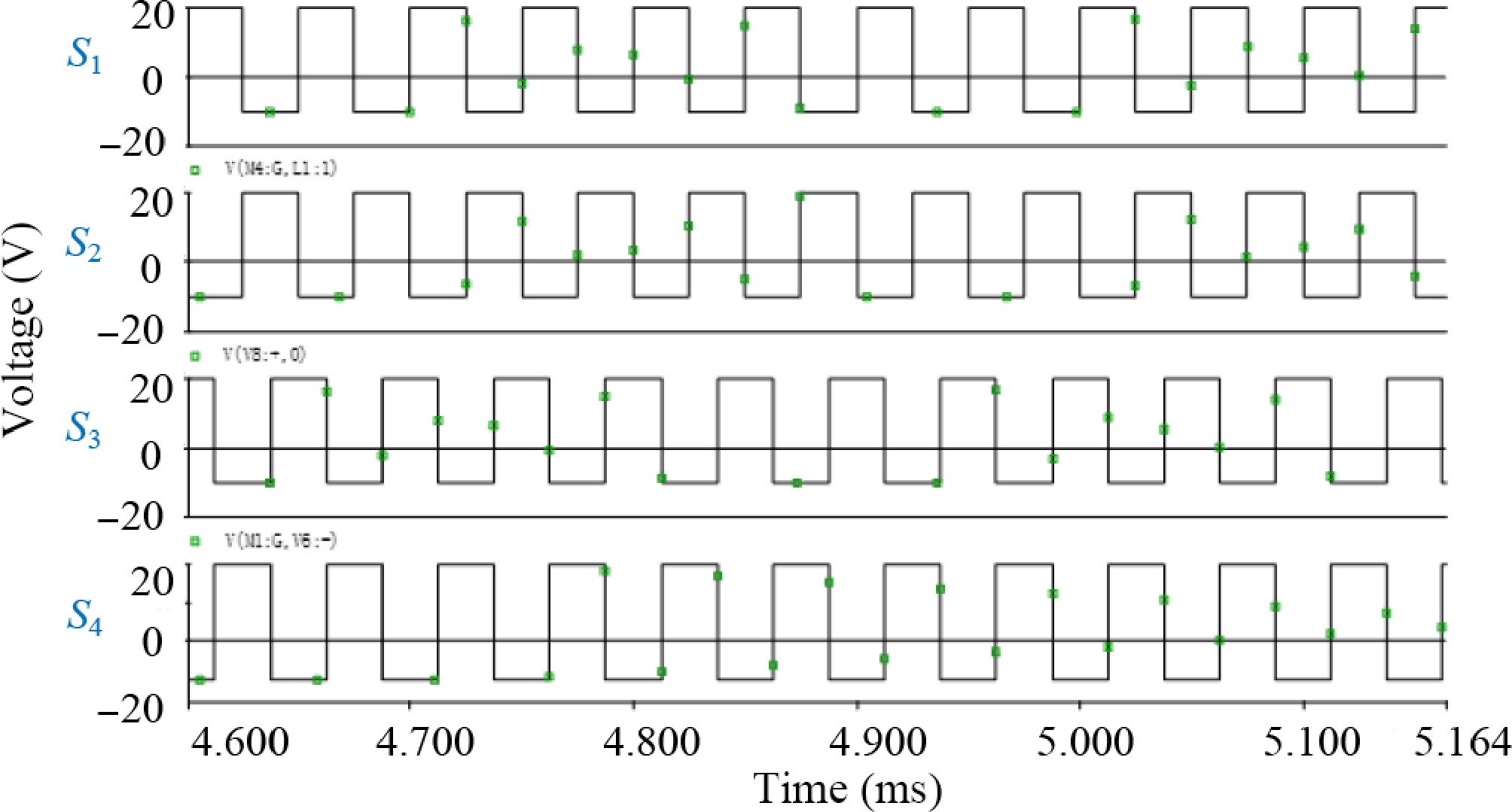 The high-frequency inverter circuit of the system uses MOSFET switches, controlled by a pulse source circuit, generating a control pulse as shown in Fig. 8. In the inverter circuit, switches S1 and S2 alternate conduction, and S3 and S4 alternate conduction, resulting in an alternating square wave voltage with a dead zone.