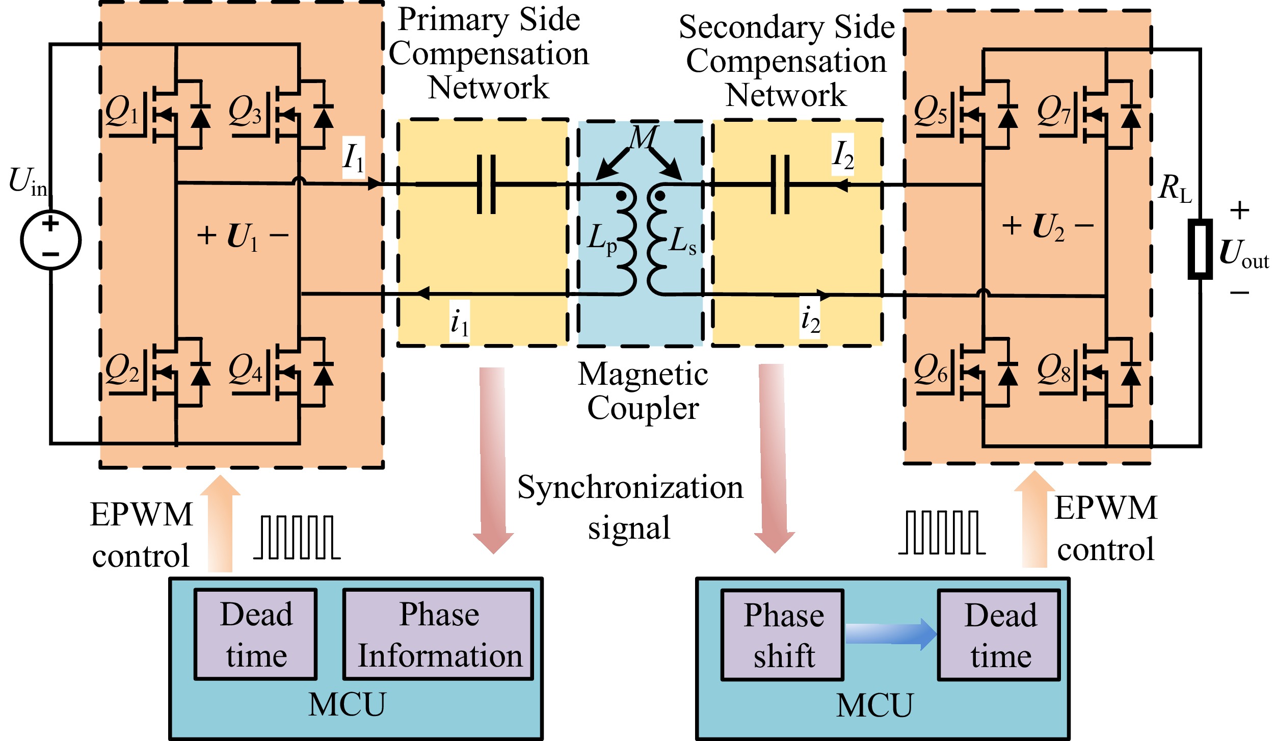 A typical BWPT system is illustrated in Fig. 1. In this configuration, two bidirectional converters—one on the primary side and one on the secondary side—control the power flow. BWPT is achieved through coil coupling combined with its compensation network. It shows a common application of the full-bridge circuit within a BIPT system. In this circuit, switches Q1–Q4 serve as the control switches for the primary-side full-bridge inverter, while switches Q5–Q8 control the secondary-side full-bridge rectifier. Lp and Ls represent the self-inductance of the primary and secondary coupling coils, respectively, with M denoting their mutual inductance. Uin and Uout are input voltage and output voltage; U1 and U2 are the voltages generated by the full-bridge inverter on the primary side and the full-bridge rectifier on the secondary side, respectively; and I1 and I2 are the corresponding AC currents on the primary and secondary sides. The primary and secondary sides are designed with hardware to capture frequency and phase signals. Under MCU processing, phase shifting and dead time settings are applied to achieve SR during power transmission.