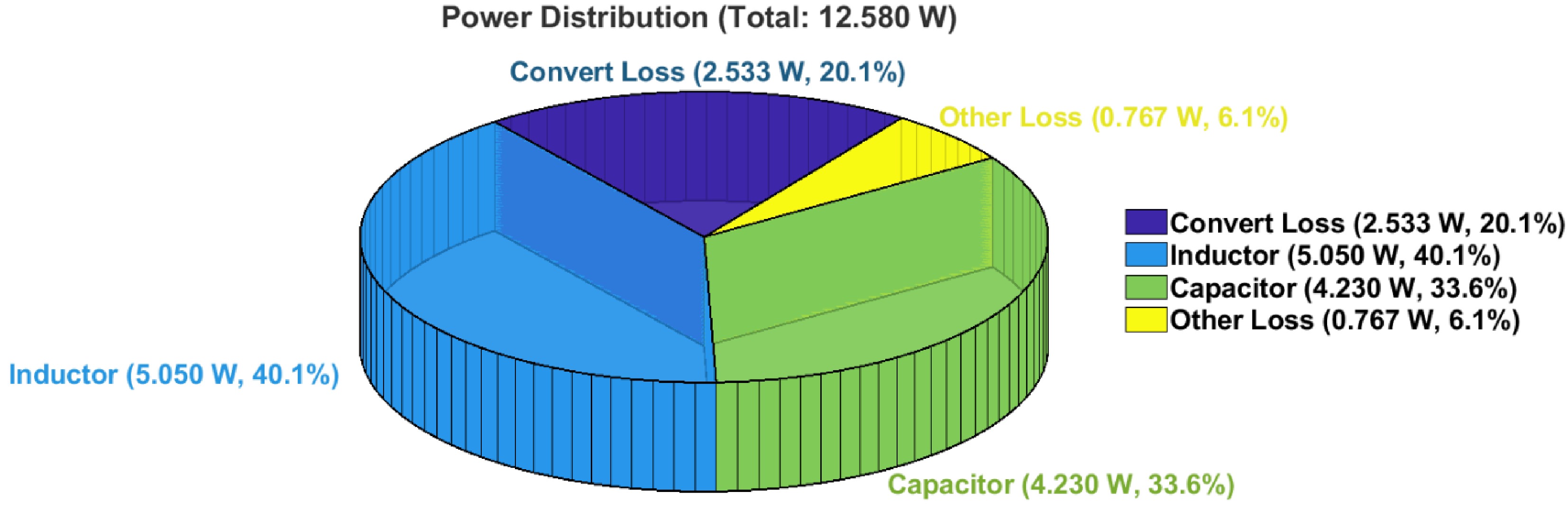 A comprehensive loss analysis of the system is presented here. It should be noted that the GaN gate drivers and the MCU are powered by an auxiliary power supply; therefore, the losses associated with the auxiliary power supply are not included in the following analysis. As illustrated in Fig. 7, the total measured power loss in the system is 12.580 W. The power losses are categorized into four main components: inductor losses, capacitor losses, converter losses[30,31], and other losses[31,32]. The 'other losses' primarily include the effects of parasitic parameters on the PCB, losses in the power analyzer connection cables, and energy dissipation in the output bus capacitors across Uout. Based on a detailed analysis of the inductor, capacitor, and GaN device losses, the power distribution is summarized in Fig. 10. From this figure, it can be observed that inductor losses constitute the largest proportion of the total losses, followed by capacitor losses. The power loss contributed by GaN devices in the converter is only 2.533 W, accounting for 20.1% of the total. These results indicate that the proposed scheme demonstrates excellent efficiency on the converter side, achieving very low switching and conduction losses in the synchronous rectification stage.