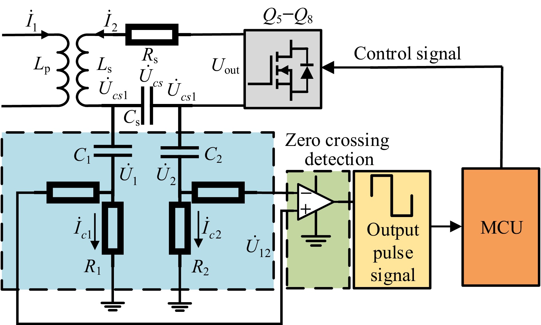 $ \left\{ {\begin{array}{*{20}{l}} {di = C\dfrac{{du}}{{dt}}} \\ {{Z_c} = \dfrac{1}{{j\omega C}}} \end{array}} \right. $ (14) It is known that the voltage across a capacitor cannot change abruptly, making it suitable for stable voltage sampling. As shown in Fig. 4, this approach uses two capacitors, C1 and C2, to filter out common-mode signals from Ucs1 and Ucs2. Then, voltage divider resistors R1 and R2 are used to obtain the ground-referenced voltages U1 and U2. These signals are then fed into a comparator, which generates a pulse signal for the MCU. Upon receiving the synchronization signal, the MCU applies phase shifting, and dead time control to the gate signals of Q5–Q8.