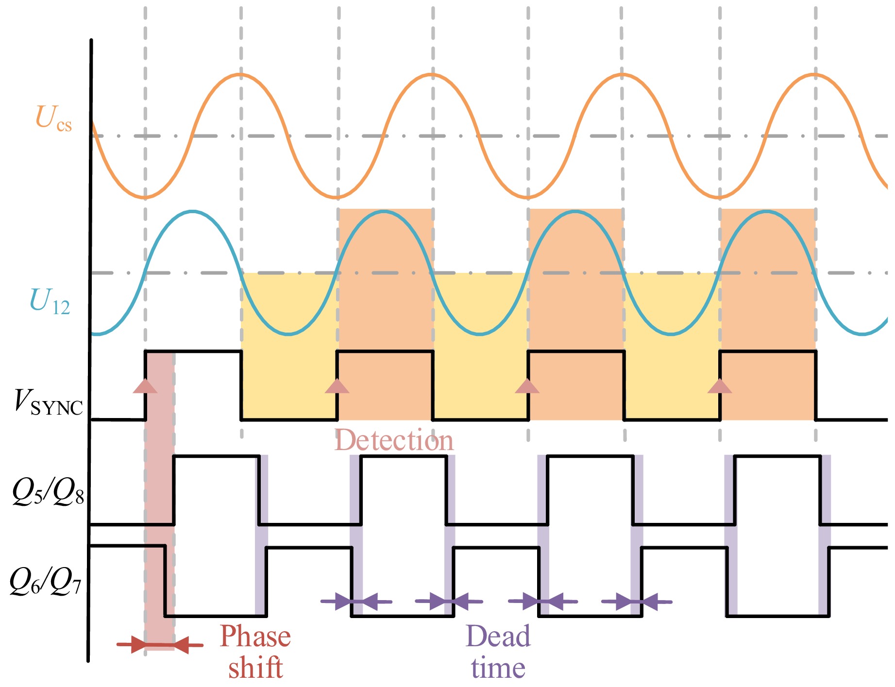$ {\dot U_{12}} = {\dot U_1} - {\dot U_2} = \dfrac{{ - j\omega {C_1}M{R_1}{{\dot U}_1}}}{{(1 + j\omega {C_1}{R_1})[({R_p}({R_L} + {R_s}) + {{(\omega M)}^2}){C_s}]}} $ (17) Based on the above equations, Ucs is processed through capacitive voltage division and common-mode signal filtering using C1 and C2, resulting in voltage U12. This voltage is then fed through a resistor into a high-speed comparator, which generates the synchronization signal VSYNC for the MCU as shown in the timing diagram in Fig. 5. When U12 > 0, the high-speed comparator outputs a high-level signal, and when U12 < 0, it outputs a low-level signal. The high-speed comparator sends a pulse signal to the MCU upon obtaining the synchronization signal, as shown in Fig. 3. The MCU compares the pulse signal, adjusts the phase and pulse frequency, and controls the switching of Q5 to Q8, achieving SR. Additionally, by controlling the dead time and phase, soft switching is realized on the secondary side, significantly reducing the turn-off losses of GaN devices and enhancing the overall system efficiency.