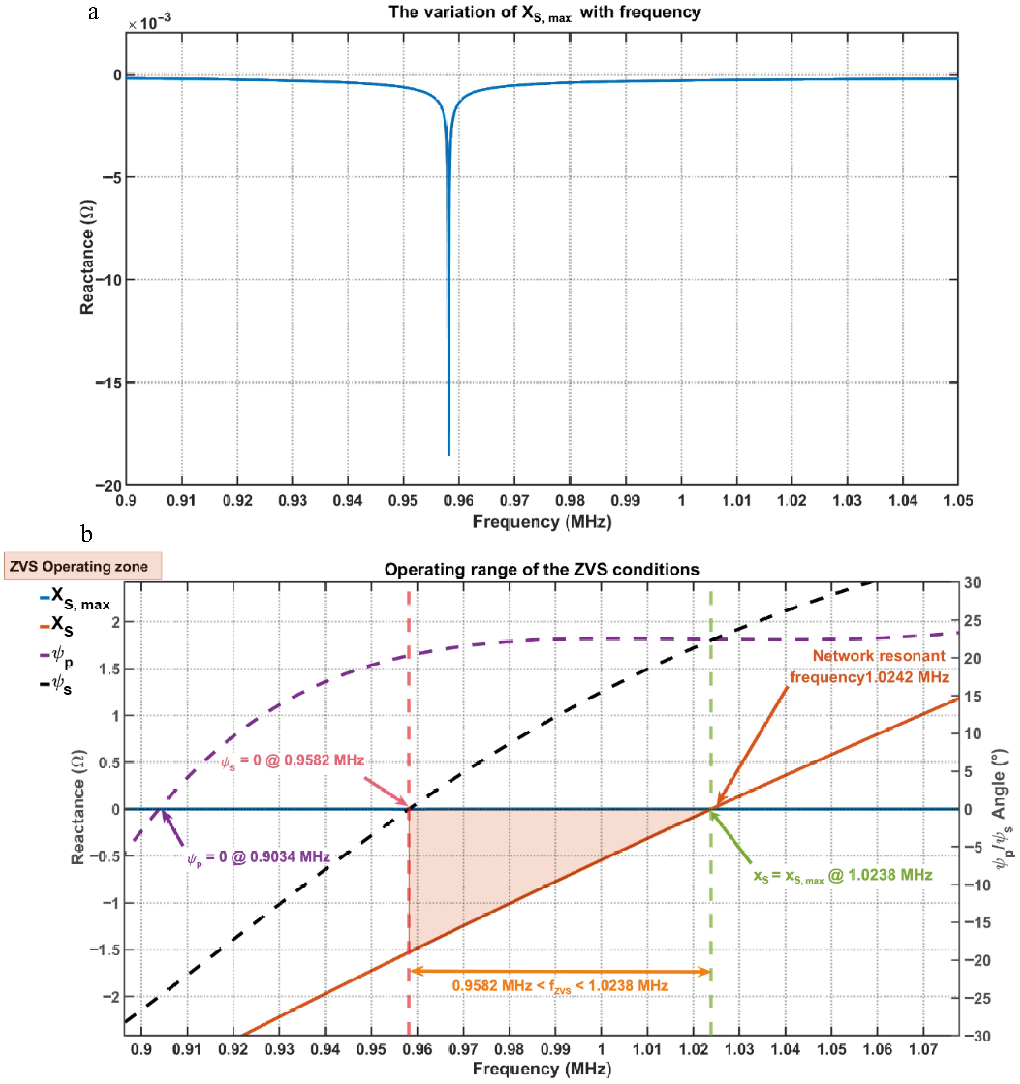 Operating range of the ZVS conditions. (a) The variation of XS,max with frequency. (b) The range of ZVS.