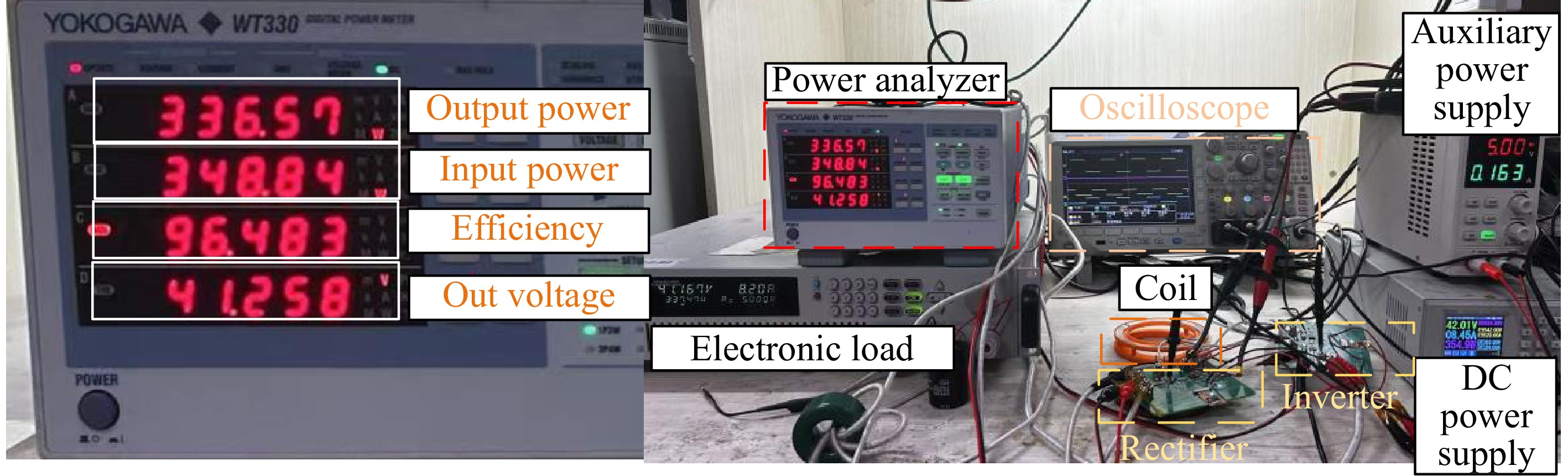Similarly, in Fig. 8c, U2 represents the voltage entering the rectifier from the compensation capacitor, i2 denotes the corresponding current, and Q5/Q8 and Q6/Q7 are the gate signals for the secondary GaN devices. Through the combined effects of the compensation network and appropriate dead-time settings, soft-switching was achieved on the secondary side. The low on-resistance of active devices reduced the voltage drop losses associated with passive rectifier power diodes, thereby enhancing system efficiency at a 1 MHz switching frequency. Under these operating conditions, the system achieved a maximum efficiency of ηmax = 96.48% and an output power of 336.57 W, as depicted in Fig. 7.