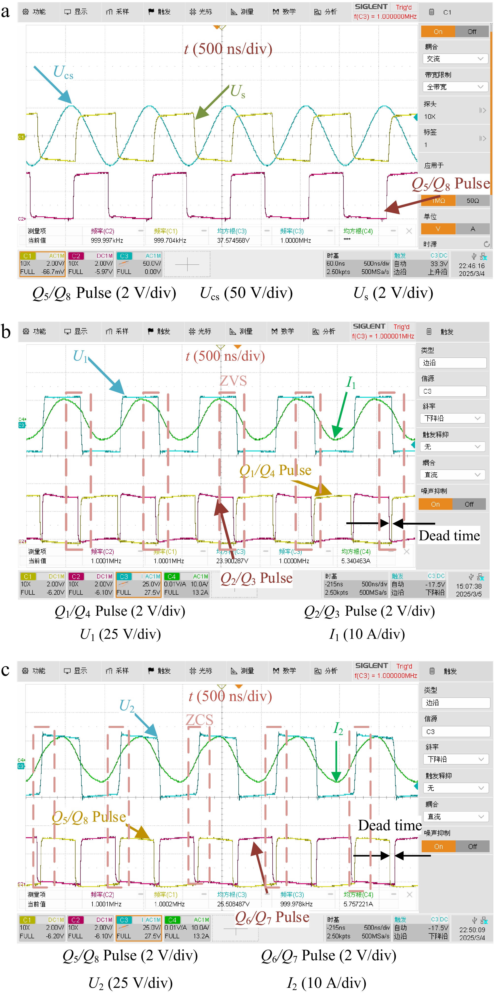 Under operating conditions with a constant input voltage Uin = 24 V, a constant resistance electronic load RL = 5 Ω, and a system switching frequency of 1 MHz, ZVS was achieved through the MCU's dead-time control of the GaN drive signals and the use of compensation capacitors. As shown in Fig. 8b, the primary waveform illustrates the primary side's soft-switching waveform and the gate control signals of the GaN devices. By maintaining a 1 MHz switching frequency on the primary side and appropriately configuring the resonant network and dead-time settings, ZVS was successfully implemented. In Fig. 8b, U1 represents the inverter's output voltage, i1 denotes the inverter's output current, and Q1/Q4 and Q2/Q3 correspond to the gate signals of the primary side GaN switches.