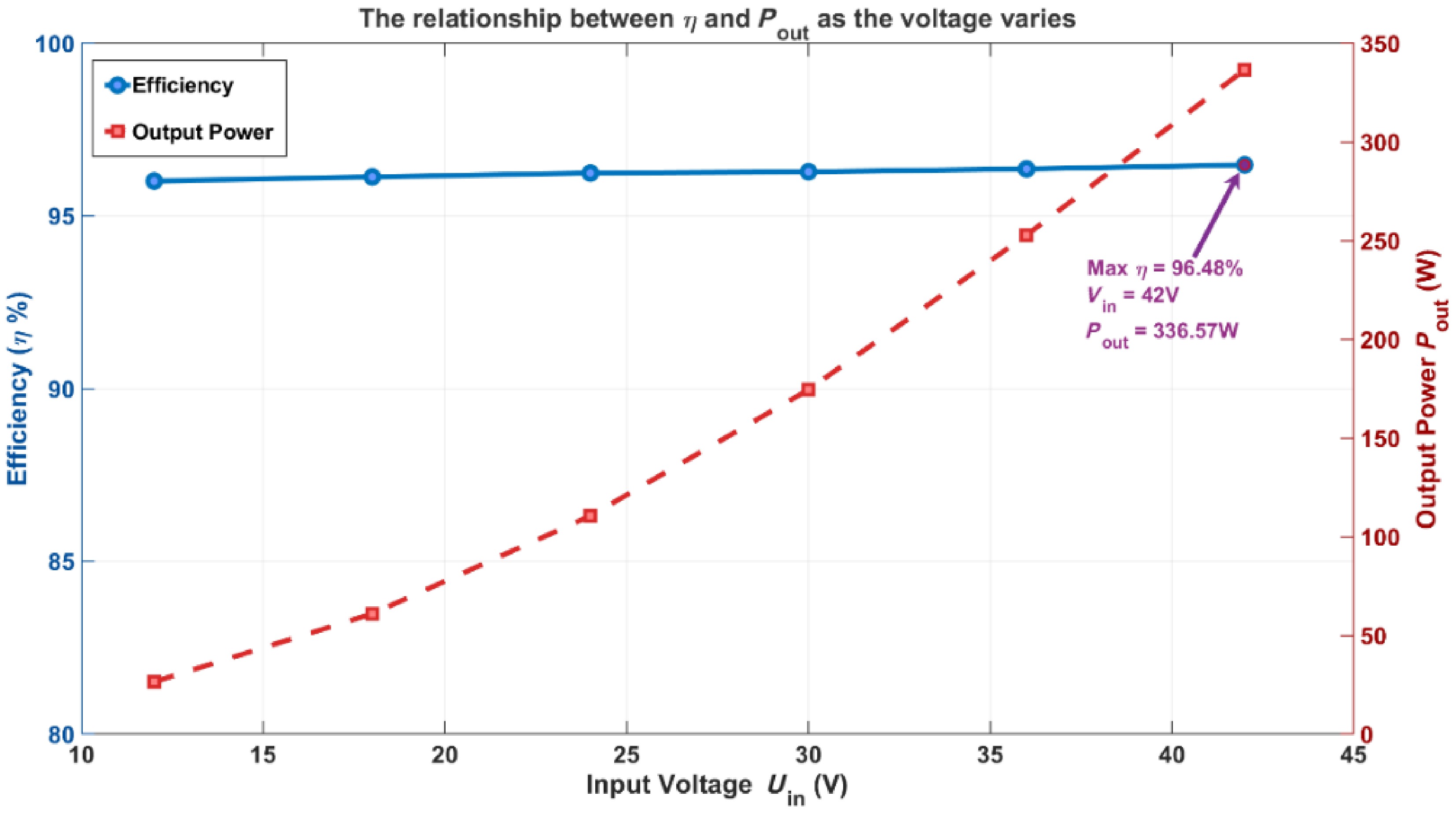 Under the constant resistance mode of the electronic load with RL = 5 Ω, the system was tested at input voltages Uin of 12, 18, 24, 30, 36, 42, and 48 V. As shown in Fig. 9, both output power Pout and efficiency η vary with the input voltage. Across all tested conditions, the overall system efficiency remained above 96%. The max efficiency η of 96.48% was achieved at an input voltage of 42 V, corresponding to Pout of 336.57 W. Throughout the tested voltage range of 12–48 V, the primary side consistently operated under ZVS, while the secondary side maintained soft switching and low-loss performance through synchronous rectification. This rectification scheme ensured high efficiency and strong system stability.