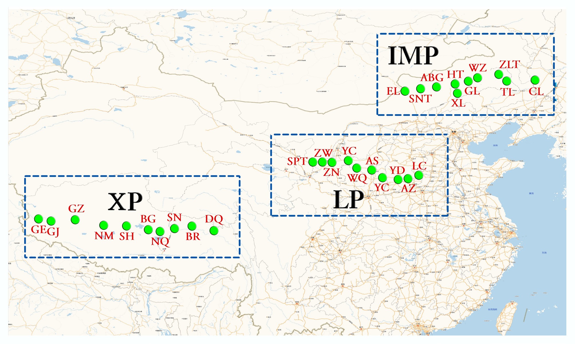Sampling sites distributed in LP, IMP, and TP steppe soils of China. The full site names of the abbreviated sample sites are listed in Table 1. LP, Loess Plateau; IMP, Inner Mongolia Plateau; XP, Xizang Plateau.