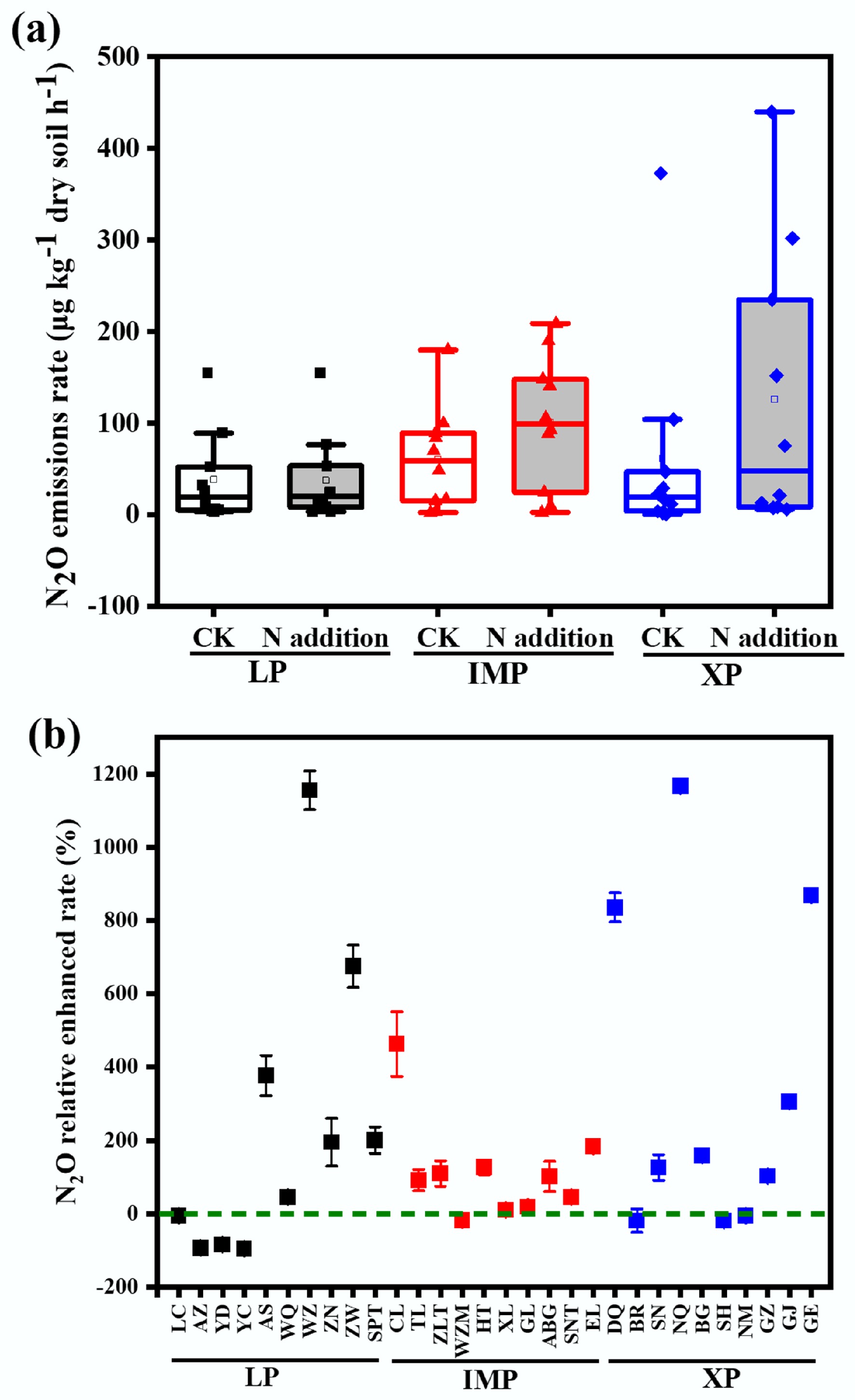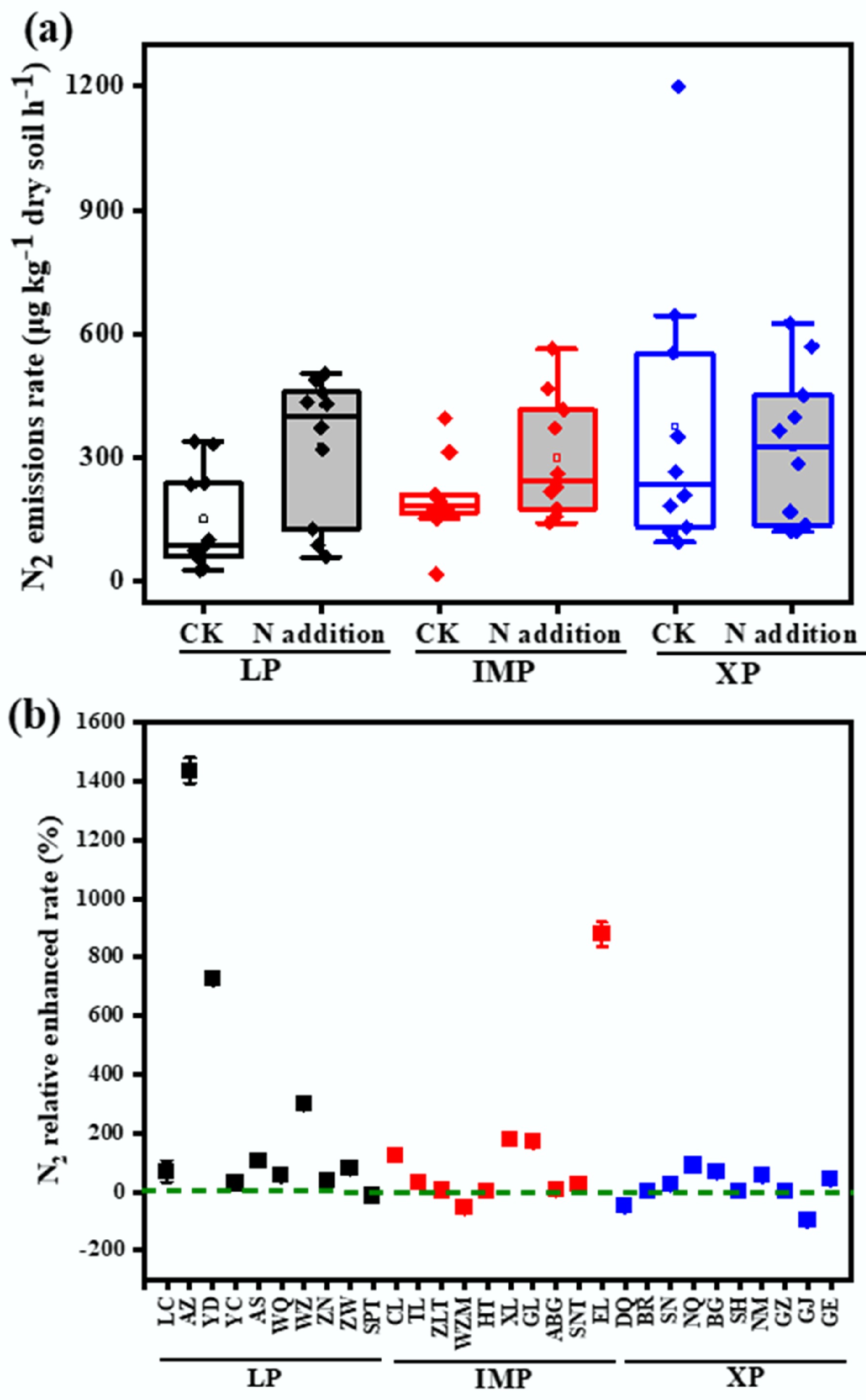 N2 emission rates of steppe soils at different sites: (a) without (CK), and (b) with N addition (N-addition), and the relative enhancement in N2 emission rates after N addition compared to the scenario without N addition (right y axis in plane (b)). Loess Plateau (LP), Inner Mongolia Plateau (IMP) and Xizang Plateau (XP) steppes. The concentration of N addition is 10 kg N ha−1.