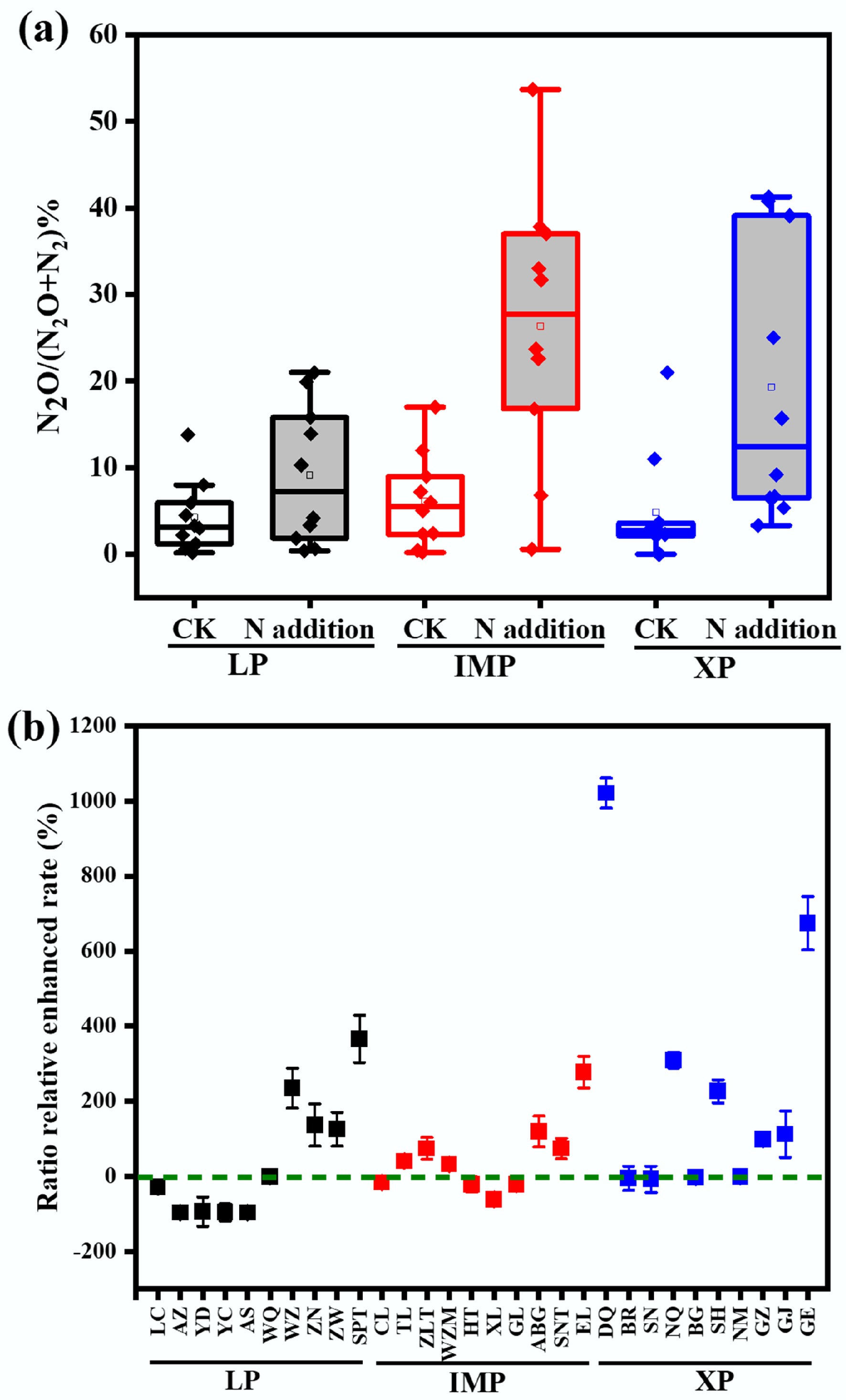 Ratio of N2O/(N2O + N2) at different sites for the Loess Plateau (LP), Inner Mongolia Plateau (IMP), and Xizang Plateau (XP) steppes: (a) without (CK) and (b) with N addition (N-addition), and the relative enhancement in ratios after N addition compared to the scenario without N addition (right y axis in plane (b)). The concentration of N addition is 10 kg N ha−1.