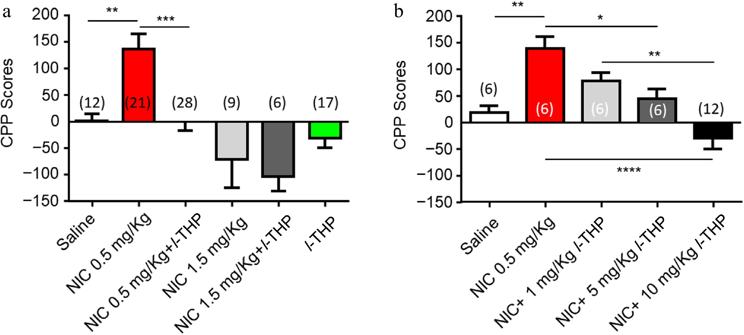 Effects of l-THP on the initiation of NIC-induced CPP. When l-THP was administered in combination with NIC, l-THP was administered i.p. 20 min before NIC injection. (a) Effects of different NIC doses administered in combination with or without l-THP. (b) Effects of different l-THP doses administered in combination with NIC (0.5 mg/kg). Data are presented by mean ± SEM. A significance levels of p < 0.05, 0.01, and 0.0001 are indicated on the graphs and correspond to *, **, **** respectively.