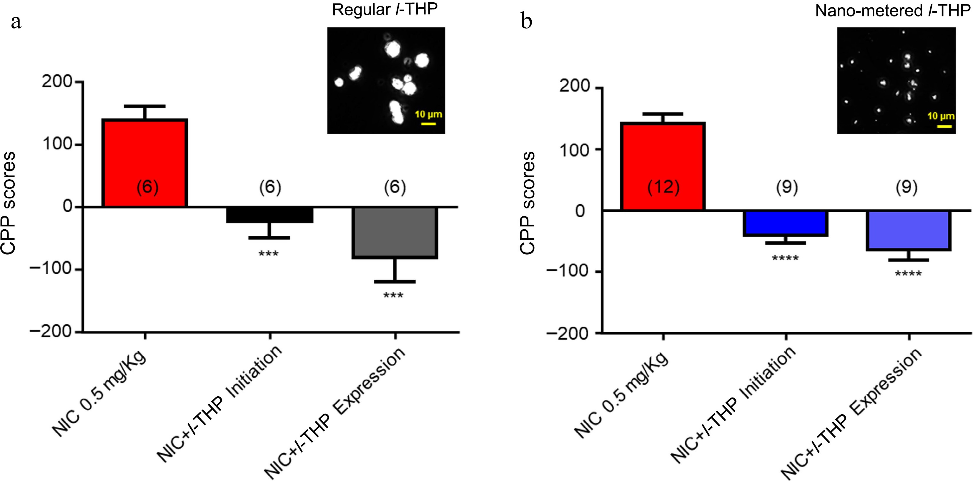 • In these experiments, the effects of different sizes of l-THP powder were compared (regular size 5−10 μm vs nano metered size 100-200 nm). As per previous experiments, results show mice have preference for NIC when administered alone (Fig. 4a & b). When regular-sized l-THP was administered with NIC according to either the CPP initiation conditioning (Fig. 2a), or the CPP expression conditioning schedule (Fig. 2b), preference for NIC was attenuated (****, p < 0.0001, Fig. 4a). When nano-metered l-THP was administered with NIC according to either the CPP initiation conditioning schedule (Fig. 2a) or the CPP expression conditioning schedule (Fig. 2b), preference for NIC was attenuated (****, p < 0.0001, Fig. 4b).
