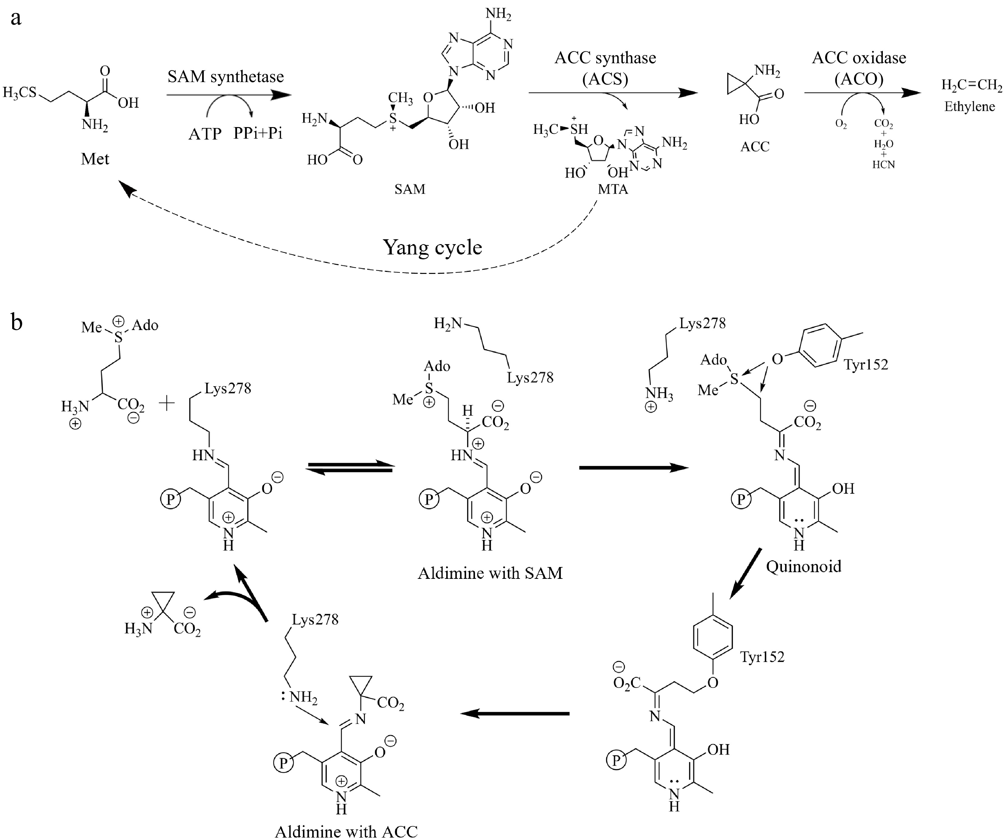 Ethylene biosynthesis pathway. (a) Ethylene biosynthesis starts with methionine (Met) as the primary substrate, followed by the sequential actions of SAM synthetase, 1-aminocyclopropane-1-carboxylic acid (ACC) synthase (ACS), and ACC oxidase (ACO). (b) A putative mechanism for the conversion of SAM to ACC.