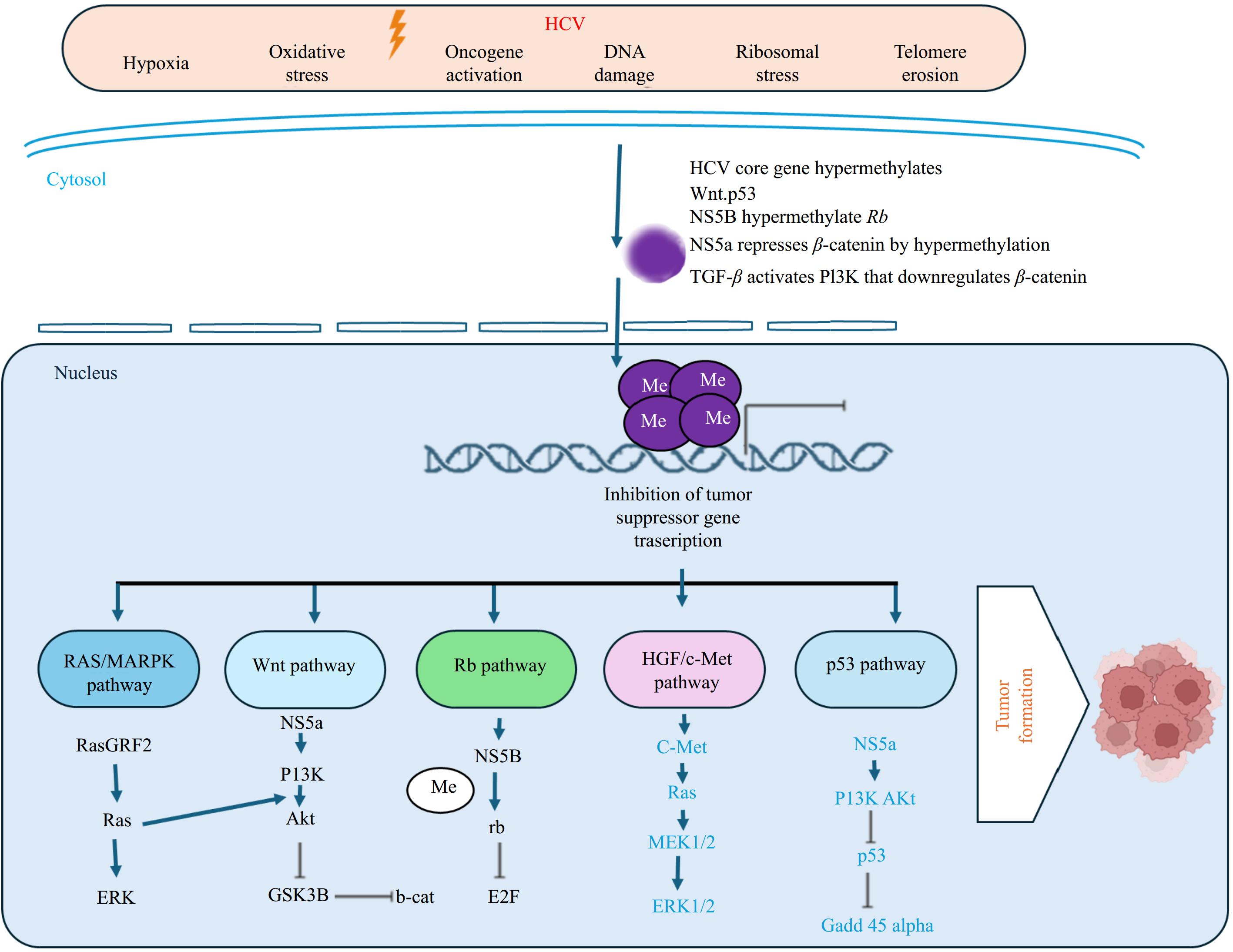 HCV infection hypermethylates promoter CpG island of Tumor Suppressor Gene and silences its activity. Different HCV genes control p53, rb, TGF-β, HGF/c-Met, RAS/MAPK, and Wnt pathways and disrupt the functionality of tumor suppressor genes Dysfunctional TSGs allow defective DNA to sneak out cell cycle checkpoints. Consequently, leads to the proliferation of cells with damaged DNA and develops tumorigenesis. Created with BioRender.com.