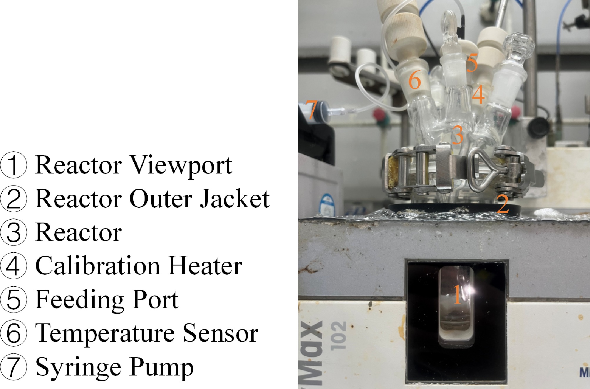 In this equation, Qr represents the reaction heat release rate (W); Qac is the accumulated heat rate of the reaction system (W); Qflow is the heat exchange power between the reaction system and the jacket (W); Qdos is the heat effect power during reagent addition (W); Qloss is the rate of heat loss from the reaction system to the external environment (W); and Qc is the calibration power of the calorimeter (W), used to determine the instrument's thermal transfer characteristics.