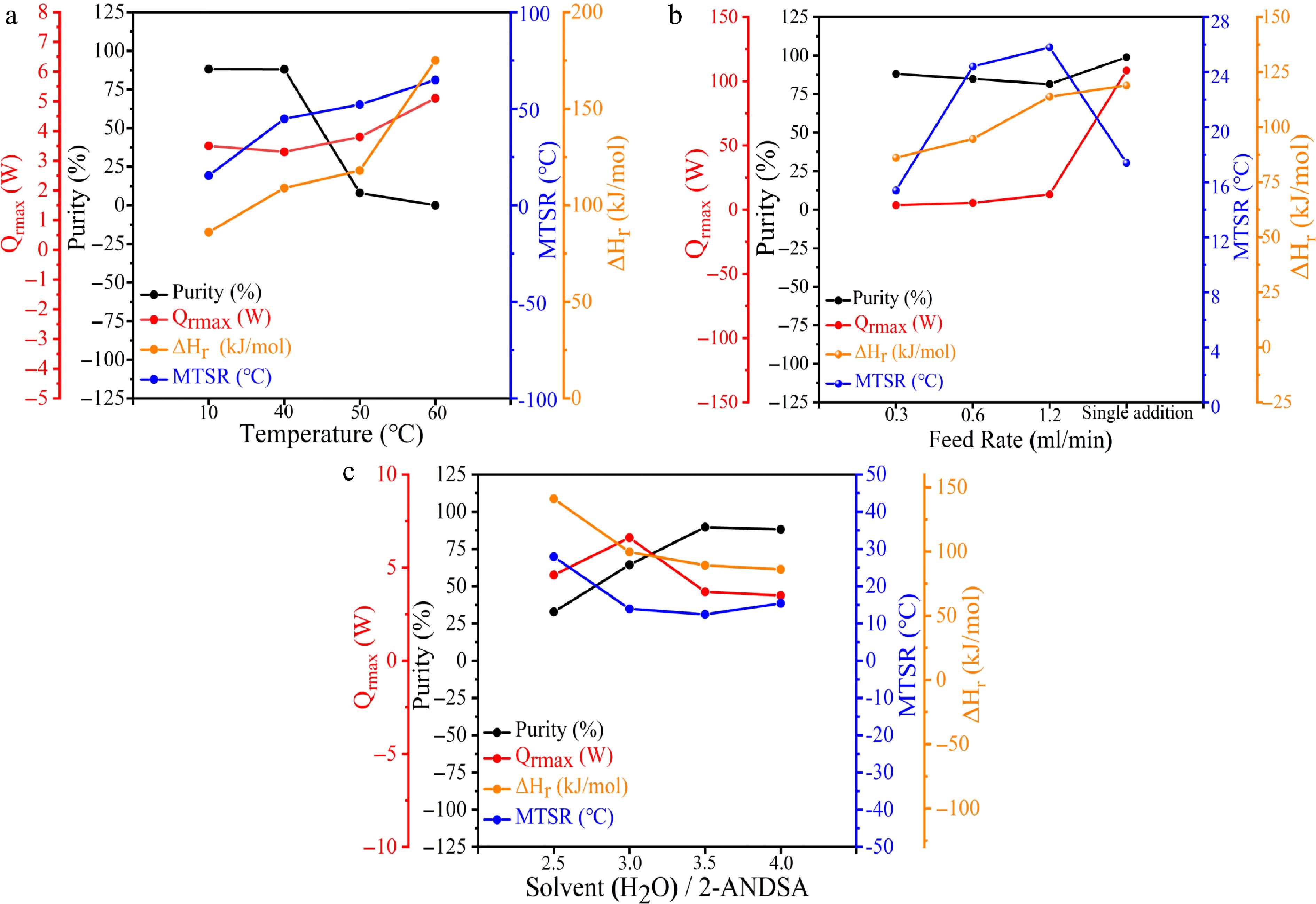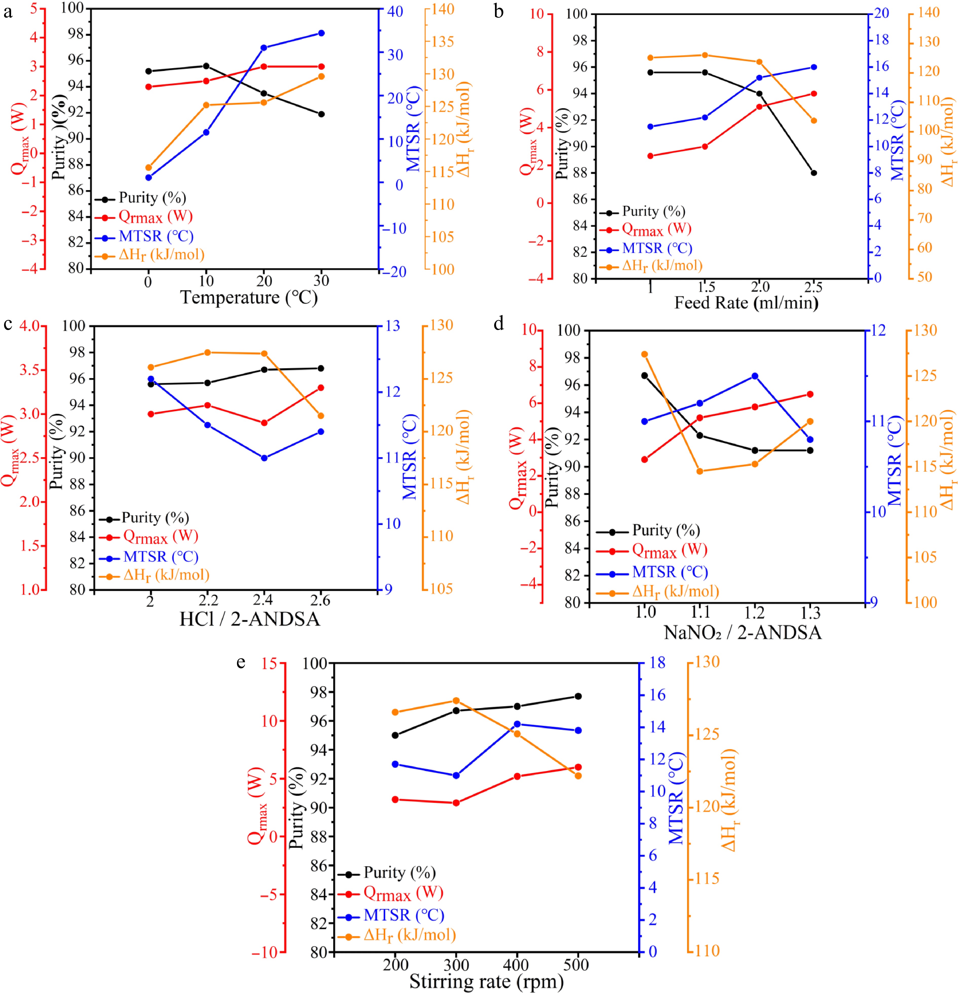 • The experimental results illustrated in Fig. 4b and Table 4 (Exp nos 1, 5–7) demonstrate that, under a constant reaction temperature of 10 °C, a feeding rate of 0.3 mL/min yields a product purity of approximately 88.1%, accompanied by a maximum heat release rate Qrmax of 3.5 W and a maximum temperature of synthesis reaction MTSR of 15.4 °C. These conditions suggest moderate thermal stability with minimal thermal risks.