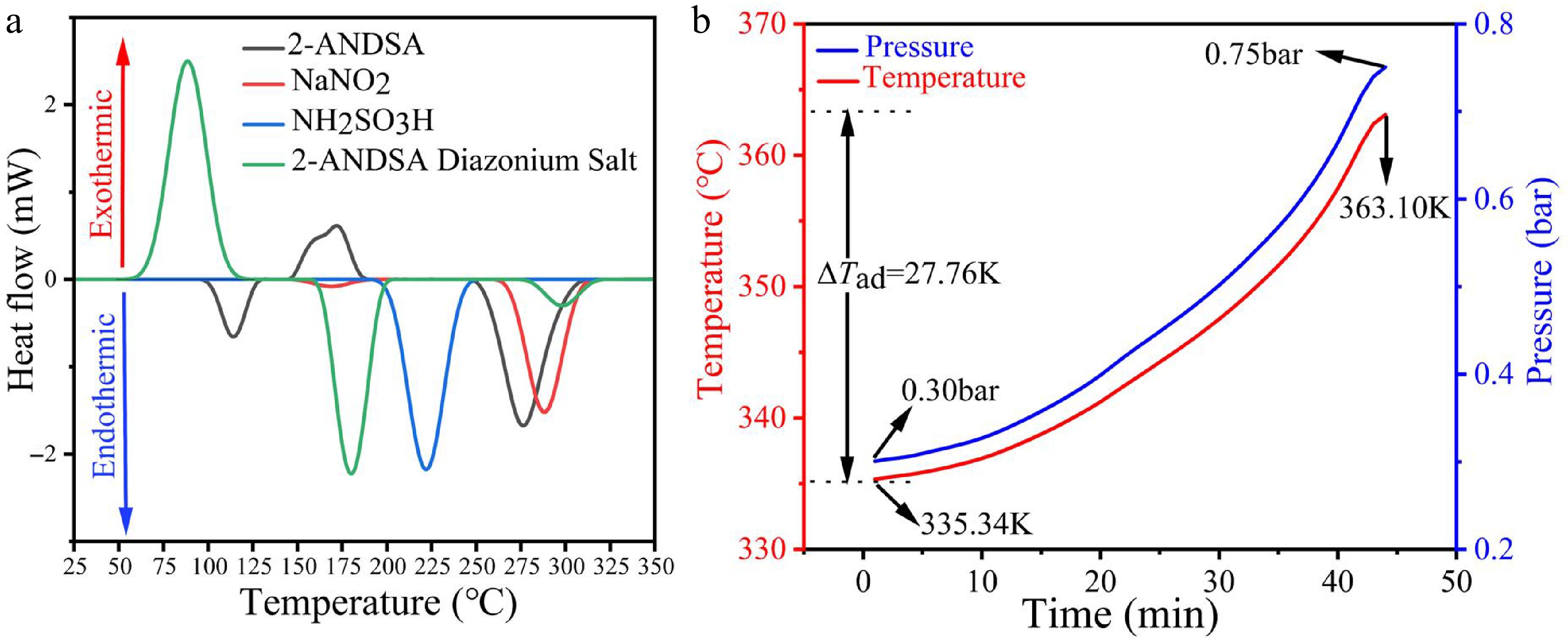Thermal behavior and hazard assessment of 2-ANDSA diazonium salt. (a) DSC thermograms of 2-ANDSA, NaNO2, NH2SO3H, and 2-ANDSA diazonium salt. (b) Adiabatic temperature and pressure profiles of 2-ANDSA diazonium salt in ARC.