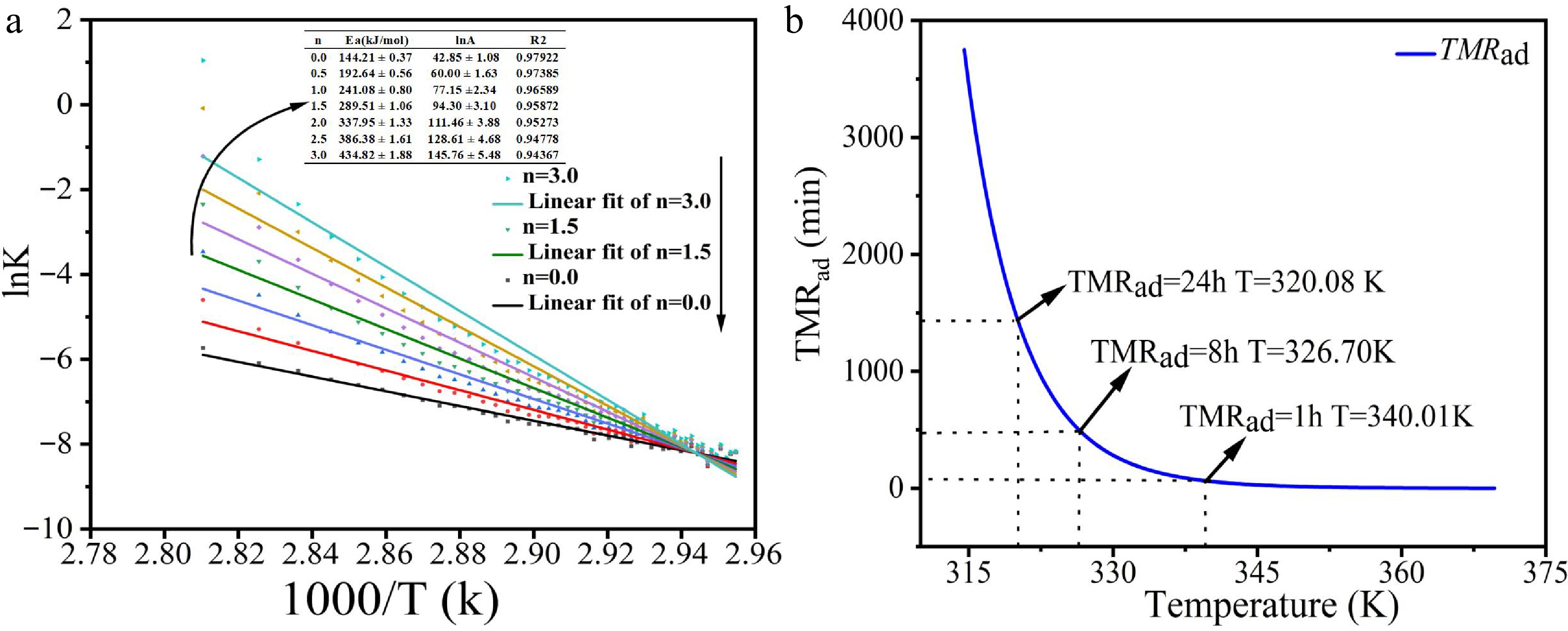 (a) Arrhenius plots (lnk vs 1/T) for various reaction orders. (b) TMRad vs temperature curves under adiabatic conditions.