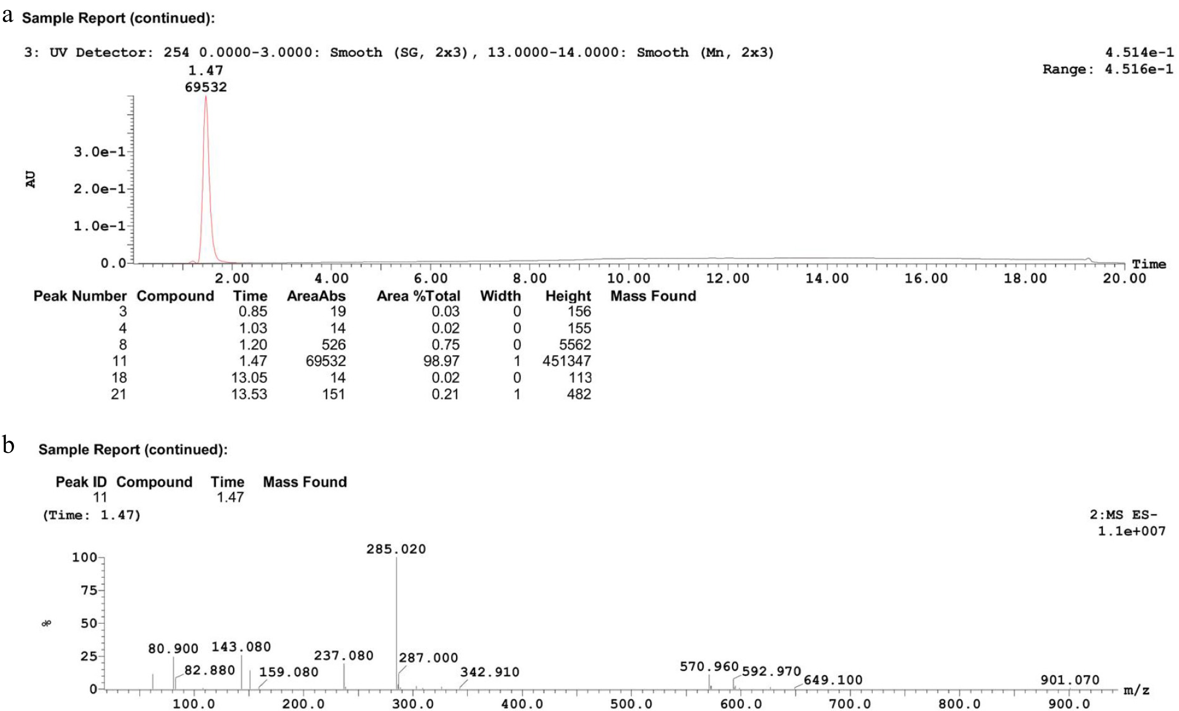 • To further elucidate the structure of the reaction product, the product from Table 1 (Exp no. 15) was analyzed by liquid chromatography-mass spectrometry (HPLC-MS) after centrifugation. The results, presented in Fig. 7a, show a distinct peak at 1.47 min with a purity of 98.97%. This represents an increase of 1.96% in purity relative to the product from Table 1 (Exp no. 15), suggesting that the product at this time point is the dominant component.