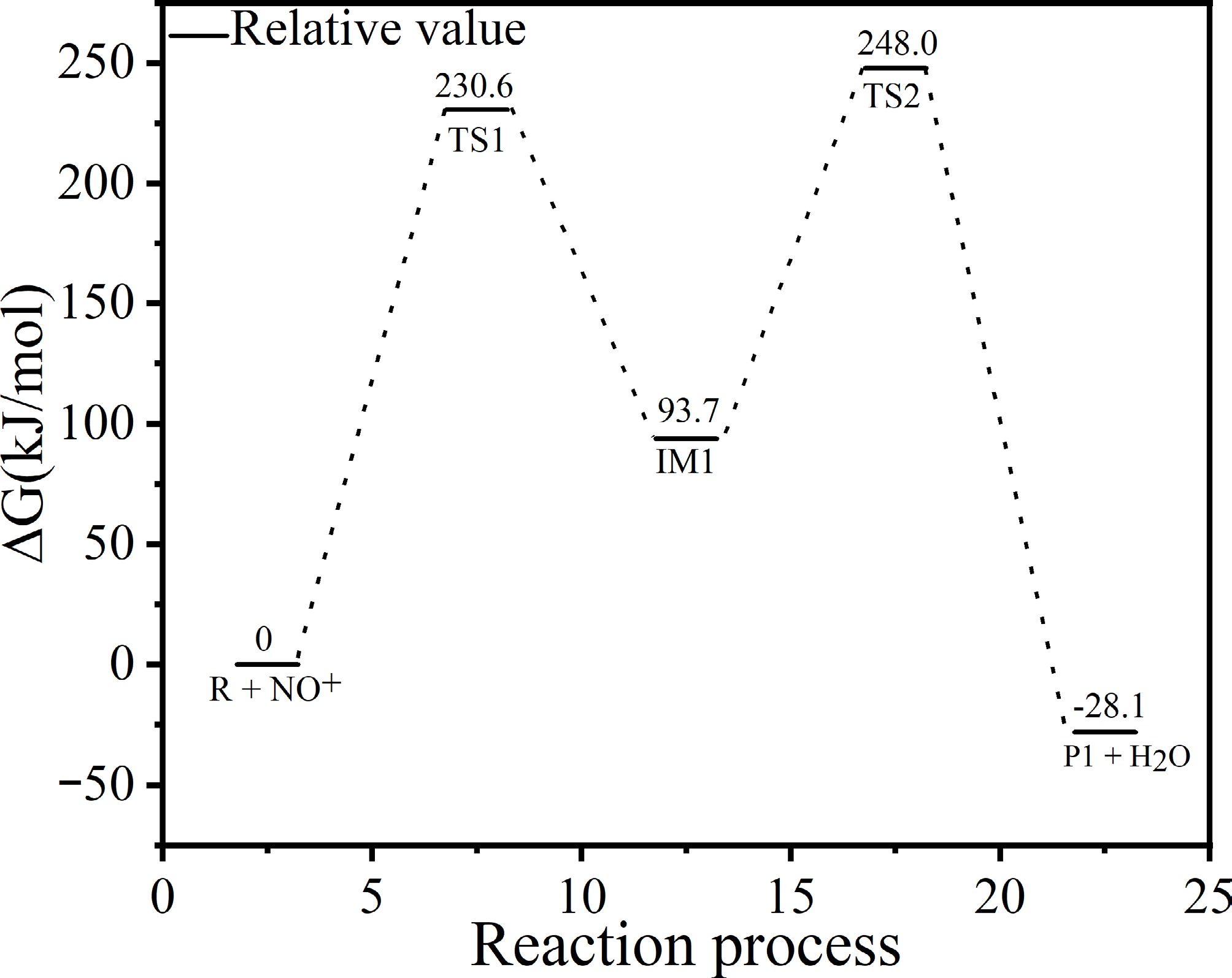 Figure 8 demonstrates that the formation of the diazonium intermediate absorbs energy, transforming into transition state TS1. The conversion from the diazonium intermediate to TS1 requires the highest activation energy barrier (230.06 kJ/mol), making it the rate-determining step of the entire reaction. During this process, a hydrogen atom from the amino group dissociates, and the dissociated hydrogen atom bonds with the oxygen atom of the nitrosonium ion (NO+), forming intermediate IM1. IM1 then continues to absorb energy, transitioning into TS2. The transition from IM1 to TS2 involves bond formation and bond dissociation, requiring a high activation energy (248.0 kJ/mol). In this process, another hydrogen atom from the amino group and a hydroxyl group (-OH) dissociate, and the hydrogen atom forms a bond with the hydroxyl group (-OH), resulting in the diazonium salt cation (P1) and H2O. The diazonium salt cation (P1) then reacts with Cl to form the final diazonium salt (P2).