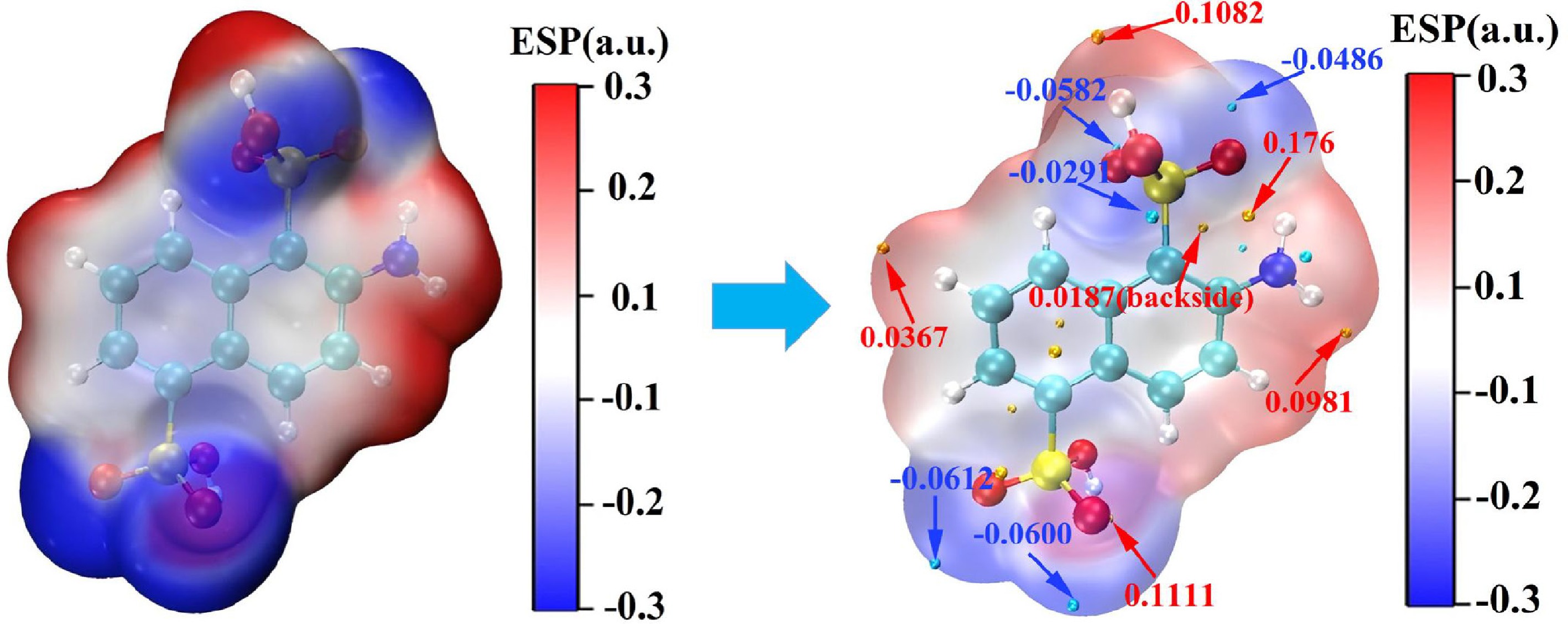 A detailed analysis of the electrostatic potential map of the 2-ANDSA diazonium salt molecule identifies the extremum points, with the blue and orange spheres representing the local minima and maxima, respectively. These points and their precise values are highlighted for comparison.
