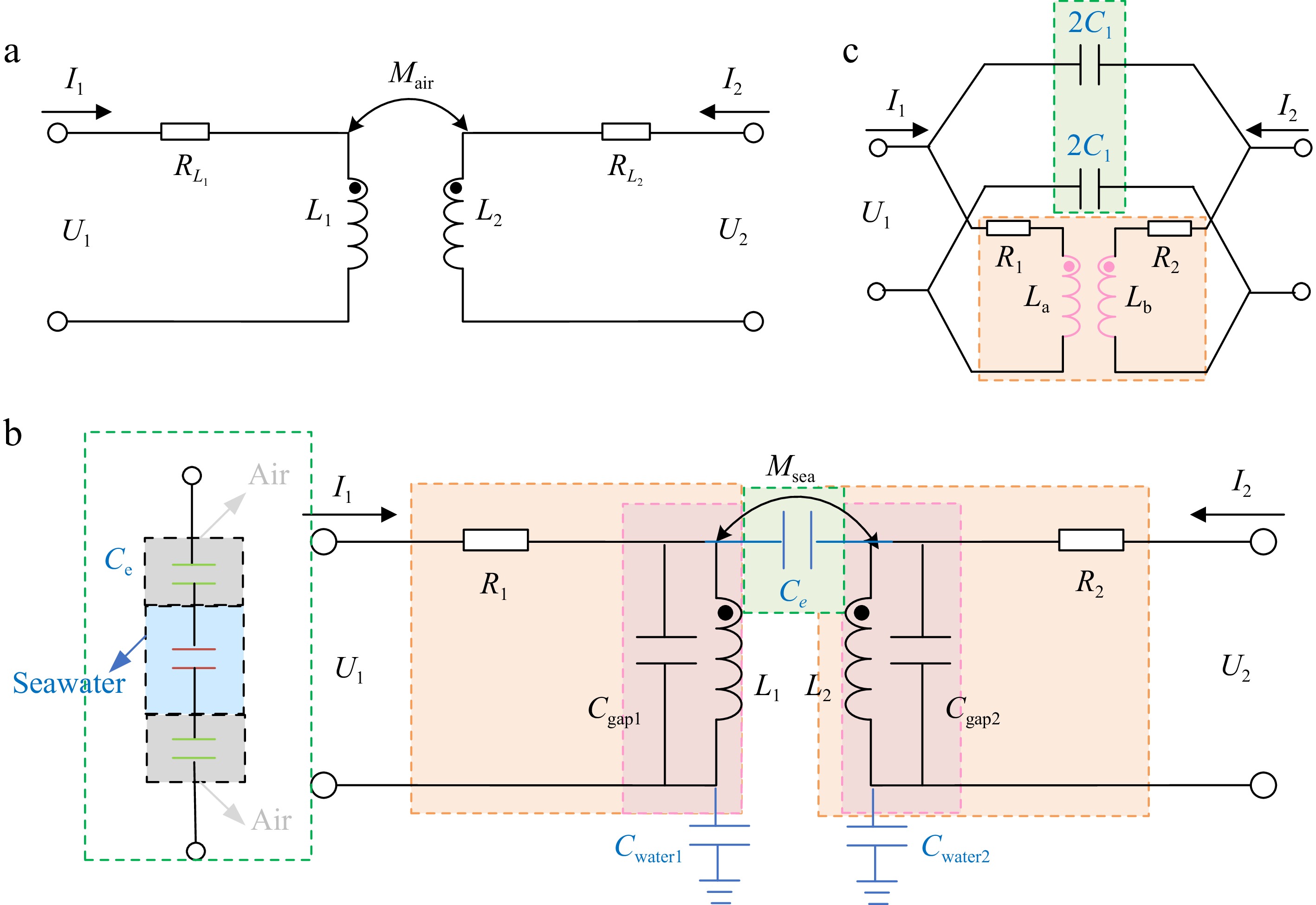 The two-port model that considers parasitic capacitance is shown in Fig. 1b Compared to Fig. 1a, it includes the stray capacitance Ce between the two coils, where Ce is derived from the series combination of the air-water-air capacitances[15], as well as the capacitances Cwater1 and Cwater2 formed between the primary and secondary coils and seawater. At this point, the resistances R1 and R2 represent the sum of the internal coil resistances RL1 and RL2, and the eddy current loss resistances in seawater Reddy1 and Reddy2[16], where R1 = RL1 + Reddy1 and R2 = RL2 + Reddy2. The coils also have inter-turn capacitances Cgap1 and Cgap2. However, the model in Fig. 1b is overly complex, and some capacitances cannot be directly measured. Therefore, the model has been simplified, as shown in Fig. 1c. In this simplified model, the coil inductances La and Lb take into account the inter-turn capacitances of the coils, which can be directly measured using a digital bridge. La = L1 / (1 − ω2 L1Cgap1), Lb = L2 / (1 − ω2 L2Cgap2). The equivalent capacitance C1 is defined as the series combination of the stray capacitance and the capacitances to seawater, which is expressed as 1 / (1/ Ce + 1/Cwater1 + 1/Cwater2), and to simplify further calculations, C1 is split into two parallel capacitors of 2C1. C1, obtained through direct measurement using a digital bridge, fully reflects the temperature characteristics and salinity effects in the actual environment. The proposed model demonstrates excellent adaptability under both low-temperature and high-salinity conditions.