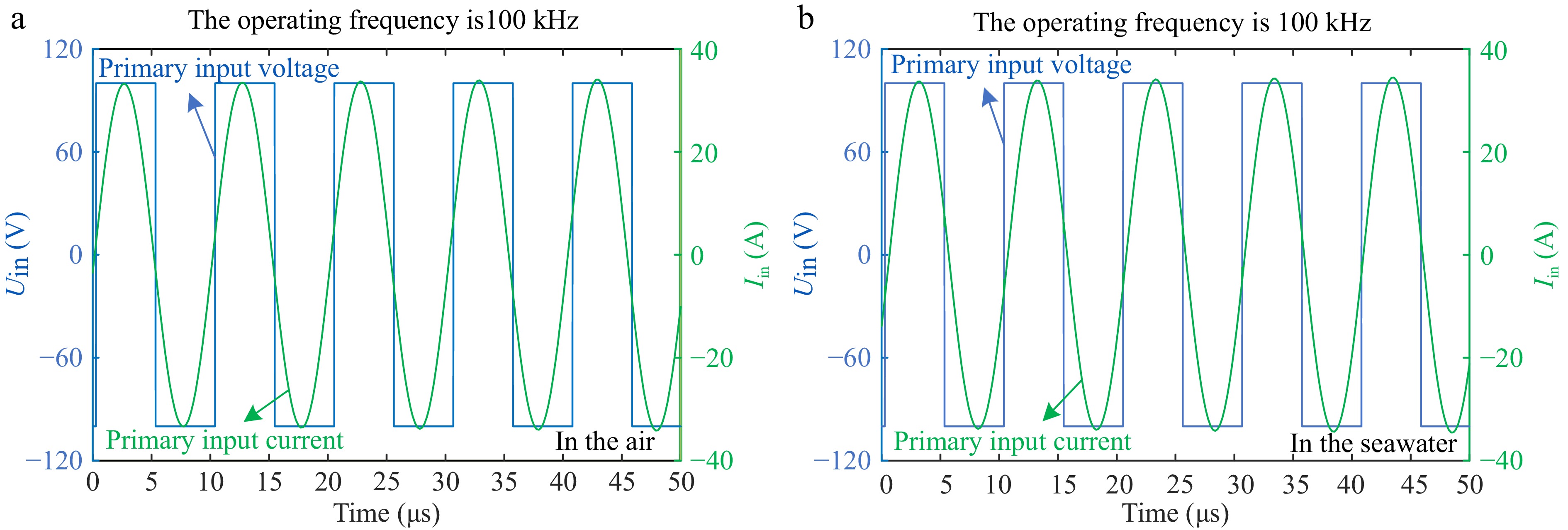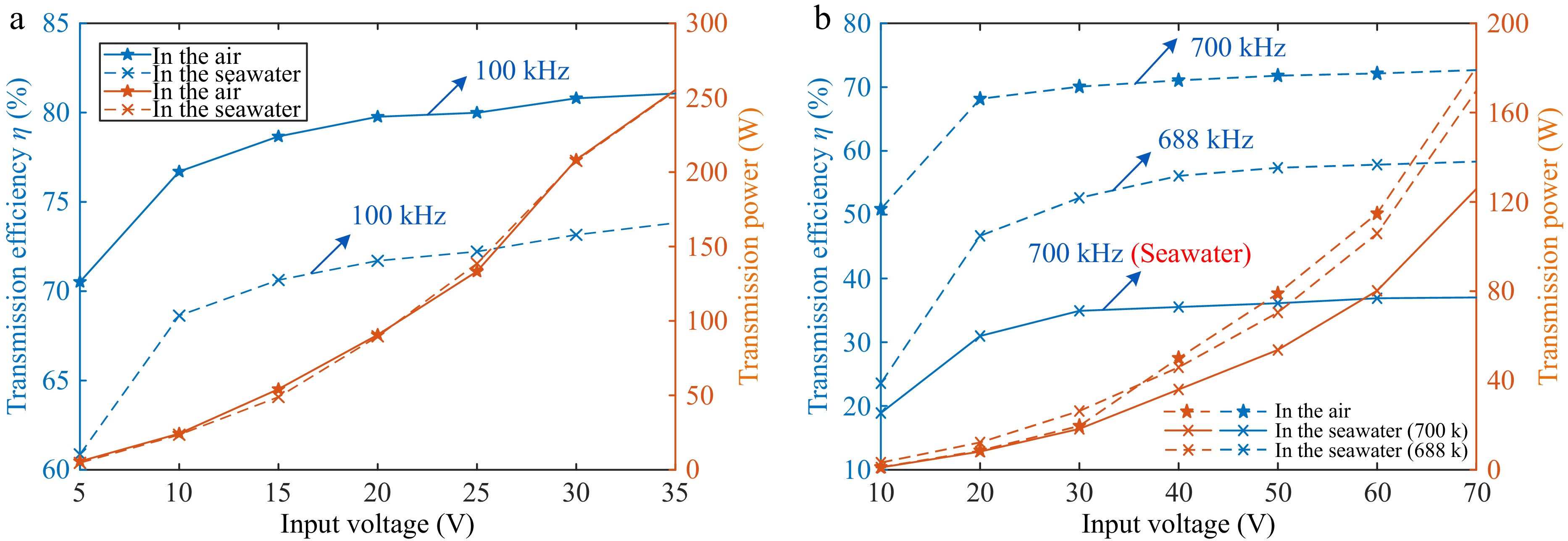 Figure 10a illustrates the transmission efficiency and power of the system in both air and seawater environments at a frequency of 100 kHz. Due to the higher conductivity of seawater, eddy current losses are induced in the system, resulting in a slightly lower transmission efficiency in seawater compared to that in air. Figure 10b compares the transmission efficiency and power in air at 700 kHz with those in seawater at 688 kHz. At high frequencies, the influence of stray capacitance causes a shift in the system's resonant state. Therefore, by adjusting the resonant frequency to 689 kHz, the system can still achieve a resonant state and maintain normal power transmission. However, the efficiency is slightly lower than that in air. Additionally, factors such as increased coil resistance at high frequencies lead to a slight decrease in transmission efficiency in air at 700 kHz.