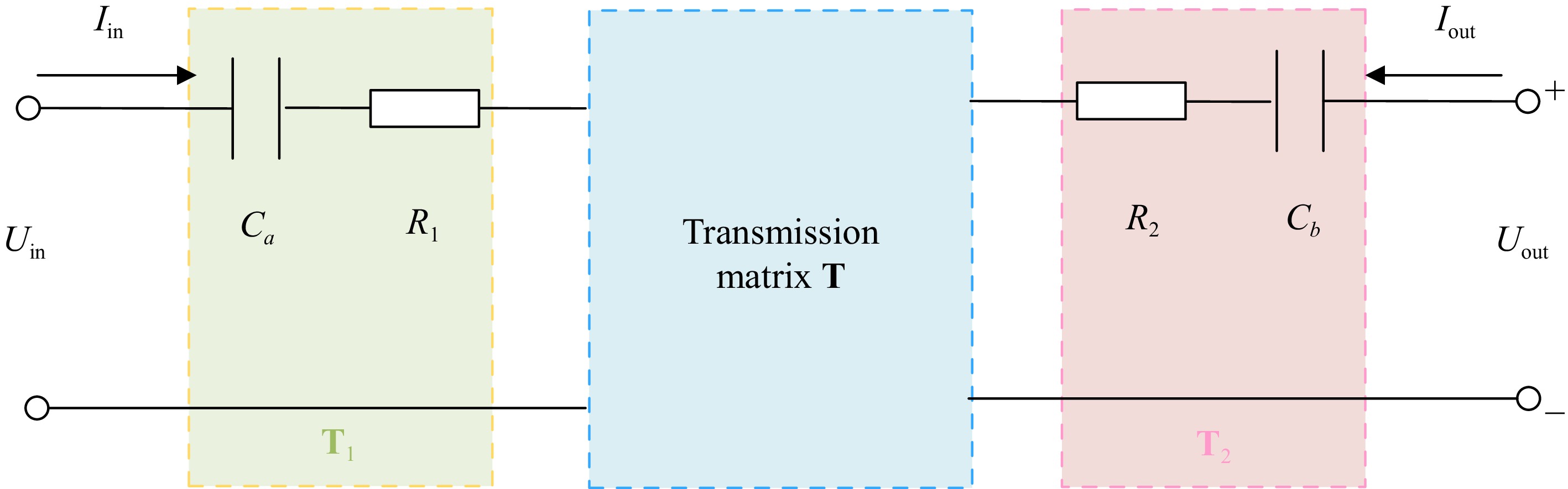 $ {{\mathbf{T}}_1} = \left[ {\begin{array}{*{20}{c}} 1&{{R_1} + 1/j\omega {C_a}} \\ 0&1 \end{array}} \right],{{\mathbf{T}}_2} = \left[ {\begin{array}{*{20}{c}} 1&{{R_2} + 1/j\omega {C_b}} \\ 0&1 \end{array}} \right] $ (10) Cascade T, T1, T2: