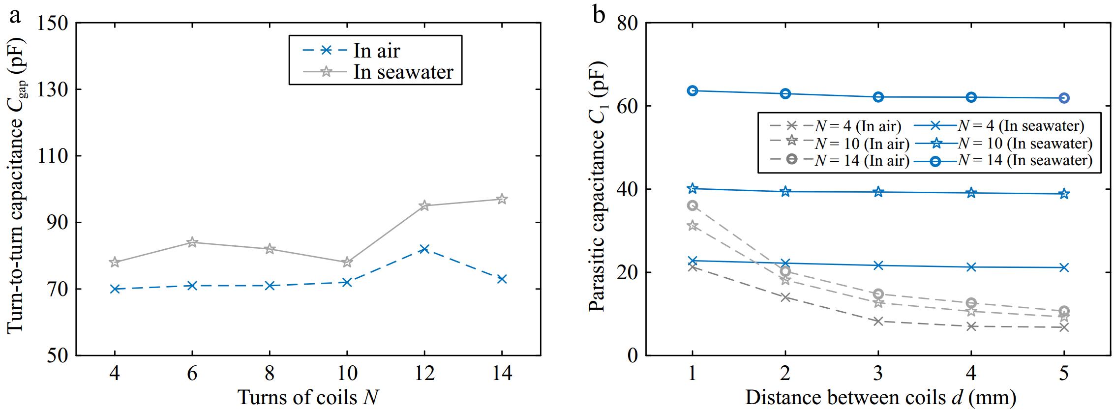 First, the inter-turn capacitance and the stray capacitance sizes were studied. The inter-turn capacitance Cgap and the stray capacitance C1 between the coils was measured using a vector network analyzer and a digital bridge. As shown in Fig. 3a, the variation of the inter-turn capacitance with different numbers of turns was analyzed in both air and seawater environments. Although the coils were placed inside an air shell, the entire setup was submerged in seawater, resulting in slightly higher inter-turn capacitance in seawater than in air. Despite some fluctuations in the curve due to measurement noise, the inter-turn capacitance increased with the number of turns in both seawater and air. As depicted in Fig. 3b, the stray capacitance C1 in air rapidly decreased as the distance between the coils increased, whereas, in seawater, C1 remained nearly constant with increasing distance. It is worth noting that when the coil undergoes lateral displacement, the stray capacitance value remains relatively stable and does not show significant displacement distance dependence. Moreover, C1 increased significantly with the number of turns in both air and seawater.