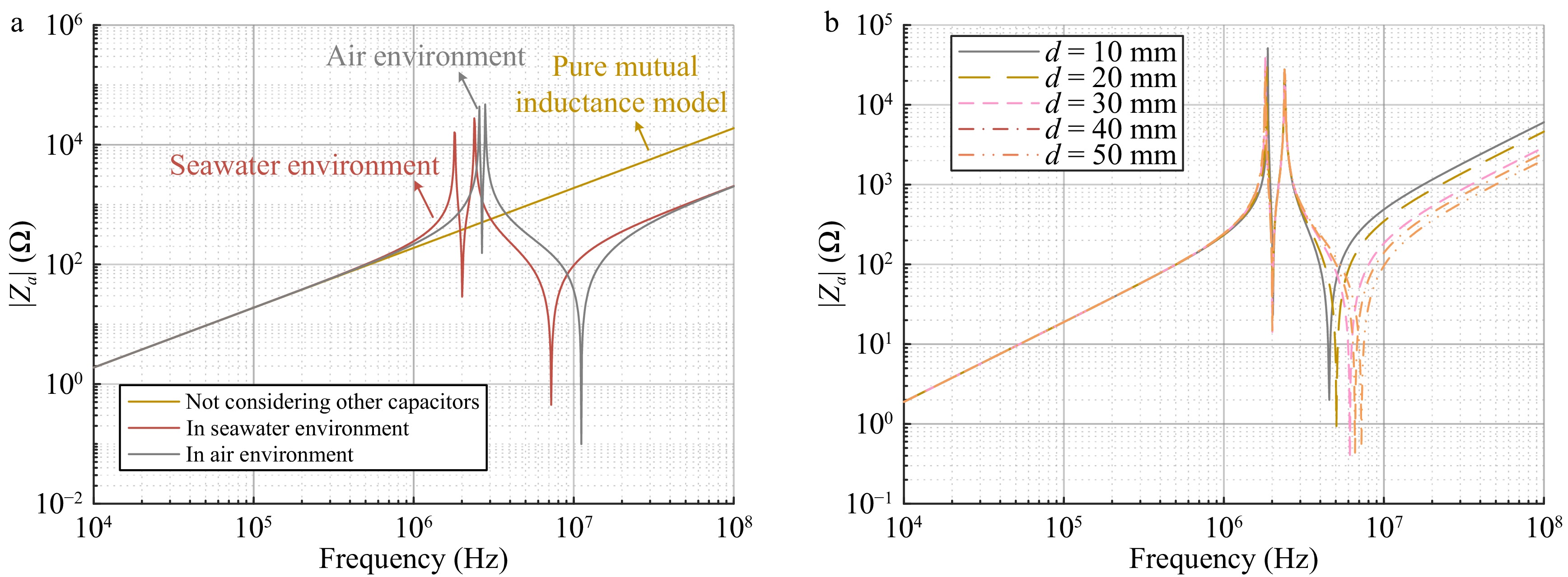 We also analyzed the frequency response of the input impedance magnitude at different distances, as shown in Fig. 4b. The curves show minimal variation, indicating that the frequency points where input impedance changes remain largely constant despite distance variations. This implies that adjusting the distance between coils does not effectively reduce the impact of stray capacitance in a seawater environment.