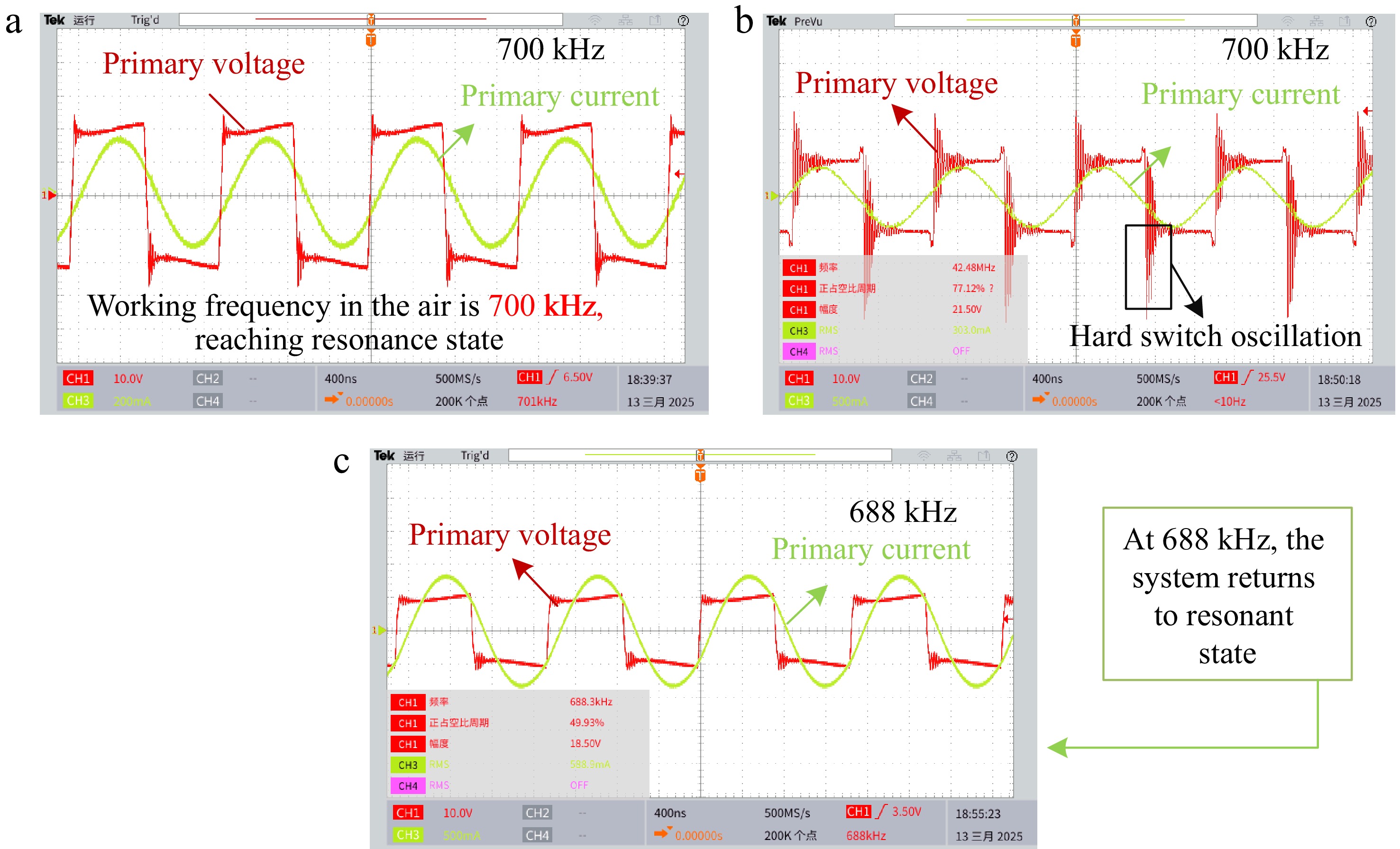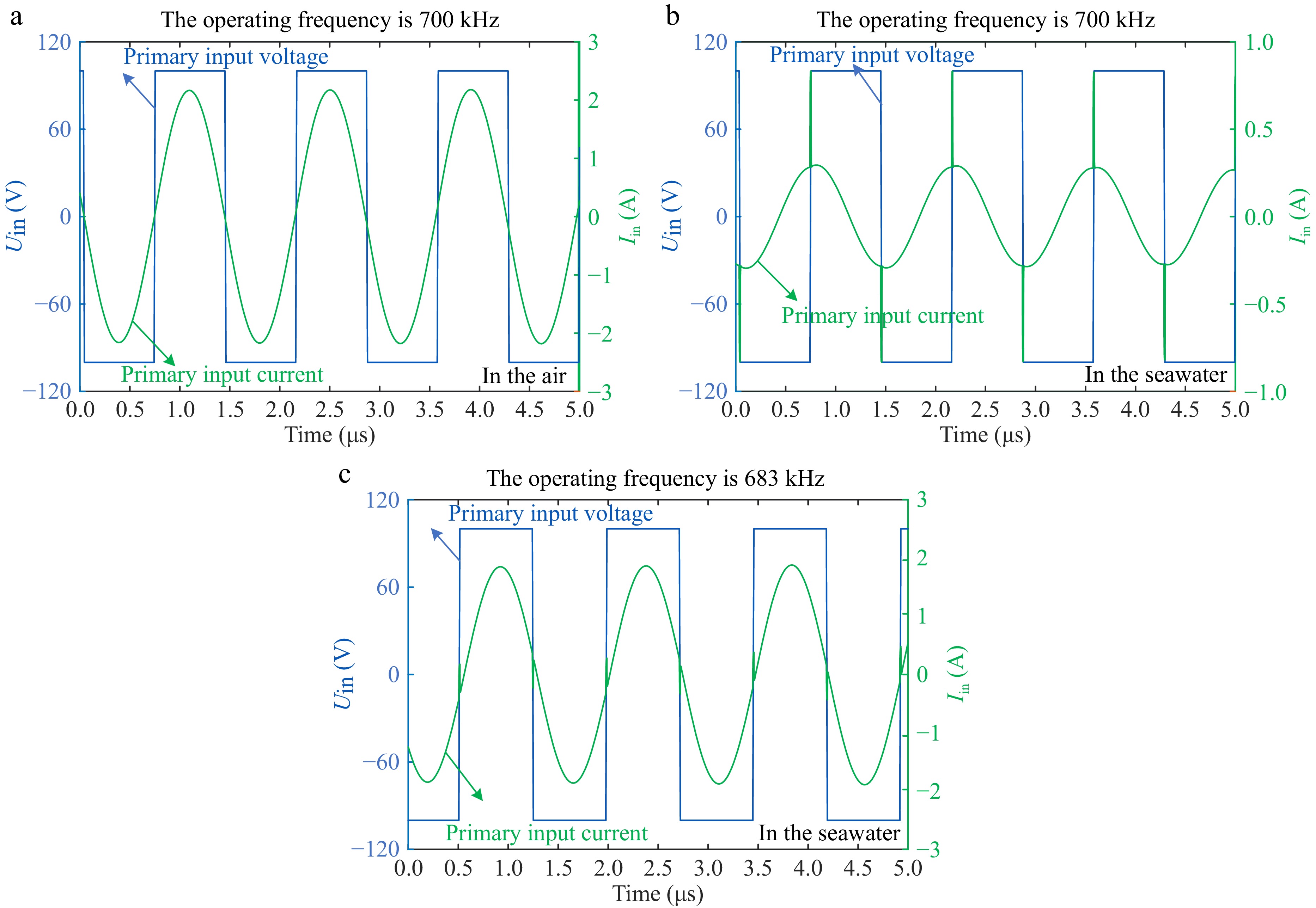 Experimental waveforms for SWPT system. (a) In the air. (b) In the seawater. (c) Readjust back to resonance state.