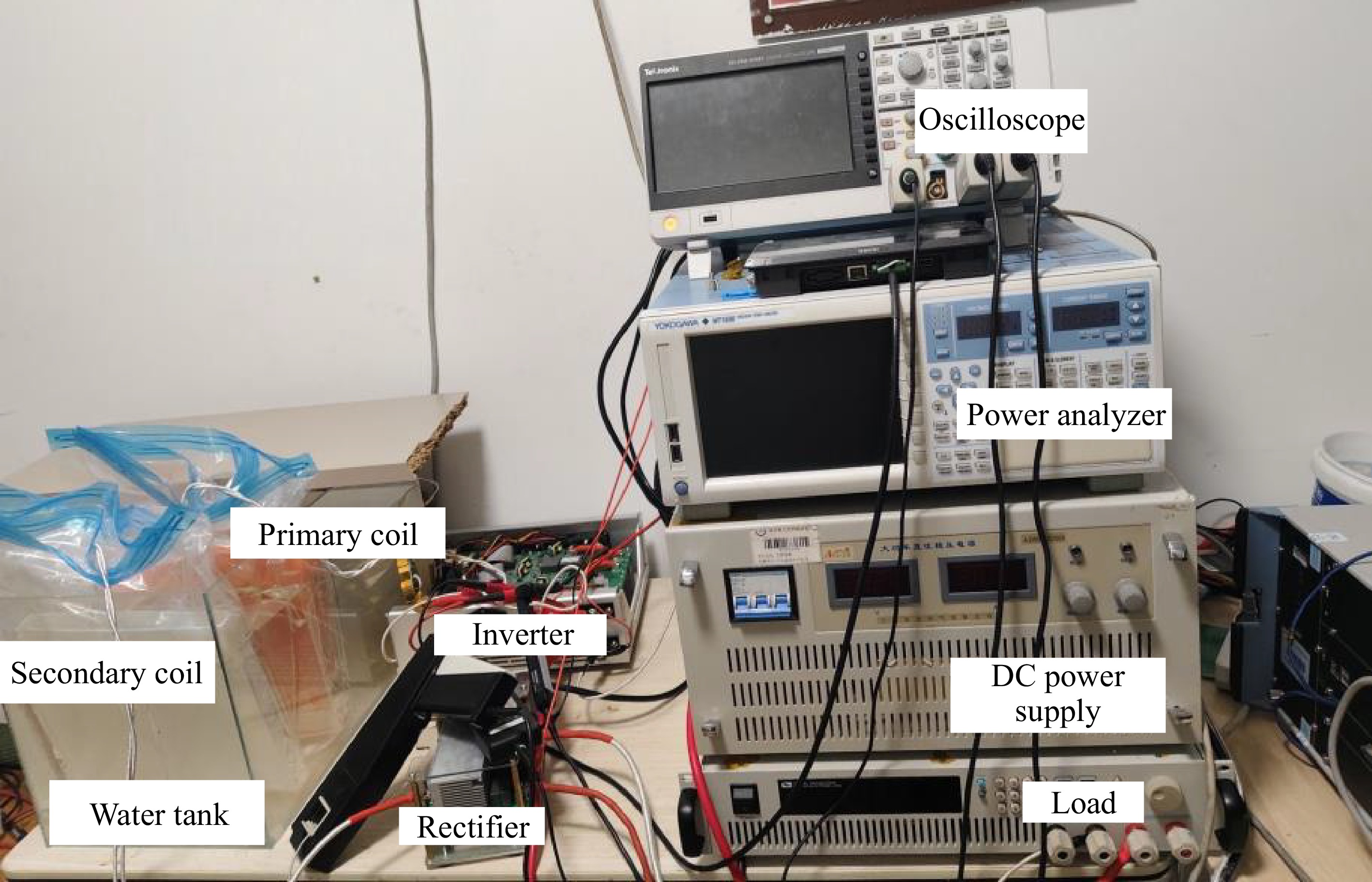 To validate the theoretical analysis, a seawater experimental prototype was developed, as shown in Fig. 7. The transmitter and receiver coils consist of three layers of flat square spiral coils, with a 4 mm radius Litz wire wound in 14 turns. The Litz wire comprises 550 strands of 0.1 mm diameter enameled wire. AC power modulation is achieved using a wide-bandgap silicon carbide (SiC) MOSFET (IMZ120R045M1) and a SiC diode (IDW40G120C5B). The conductivity of the seawater is adjusted to 4 S/m.