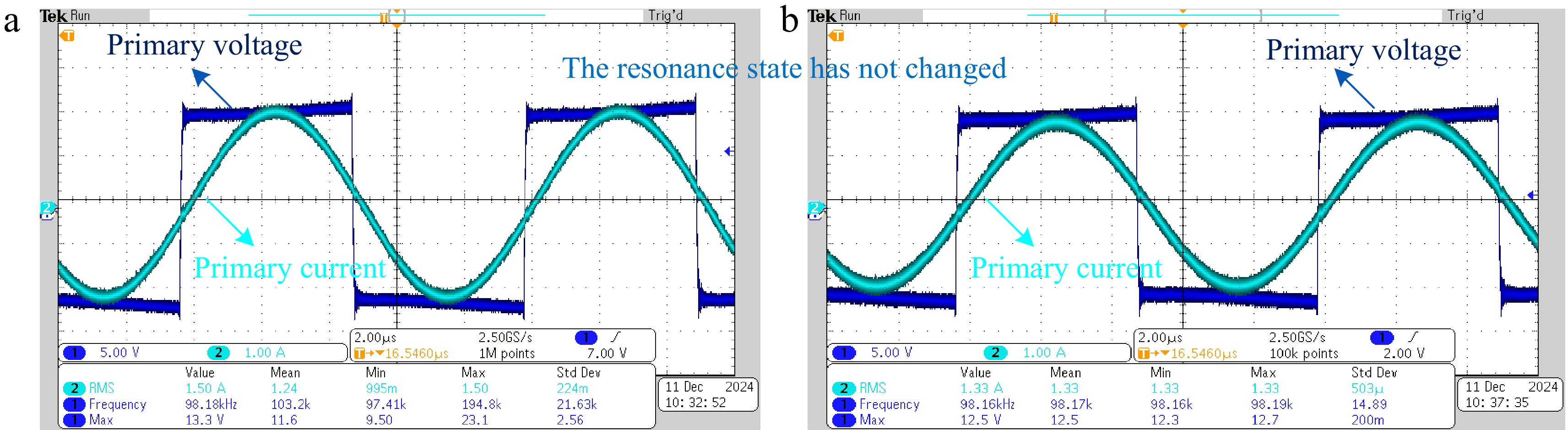 With the input voltage set to 100 V, as shown in Fig. 5a, the system reaches resonance at 100 kHz. The resonance condition remains unchanged after introducing stray capacitance into the system, as depicted in Fig. 5b. This demonstrates that the stray capacitance does not affect the system's resonance at low frequencies. The simulation results are in close agreement with the calculated values.