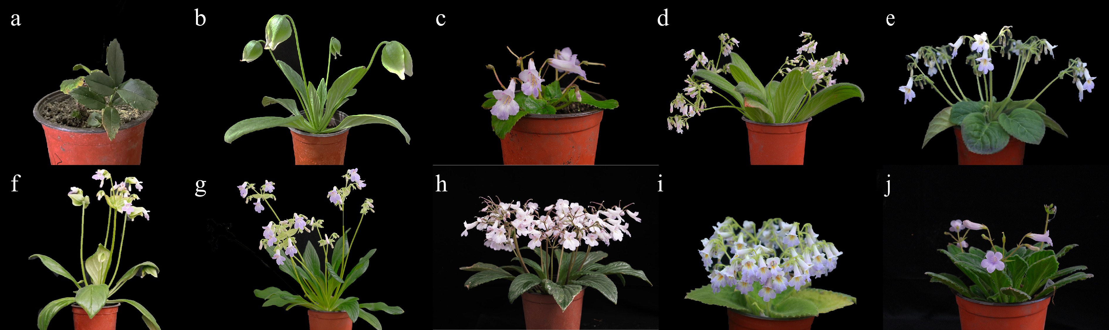The ten taxa of Gesneriaceae used in this study. (a) L. pauciflorus, (b) P. eburnea, (c) P. fimbrisepala, (d) P. medica, (e) P. 'Nandia Dreams', (f) P. 'Venus', (g) P. 'The Smurfs', (h) P. 'Spring of Beilin', (i) P. 'Purple Sundae', (j) P. 'Four Seasons'.