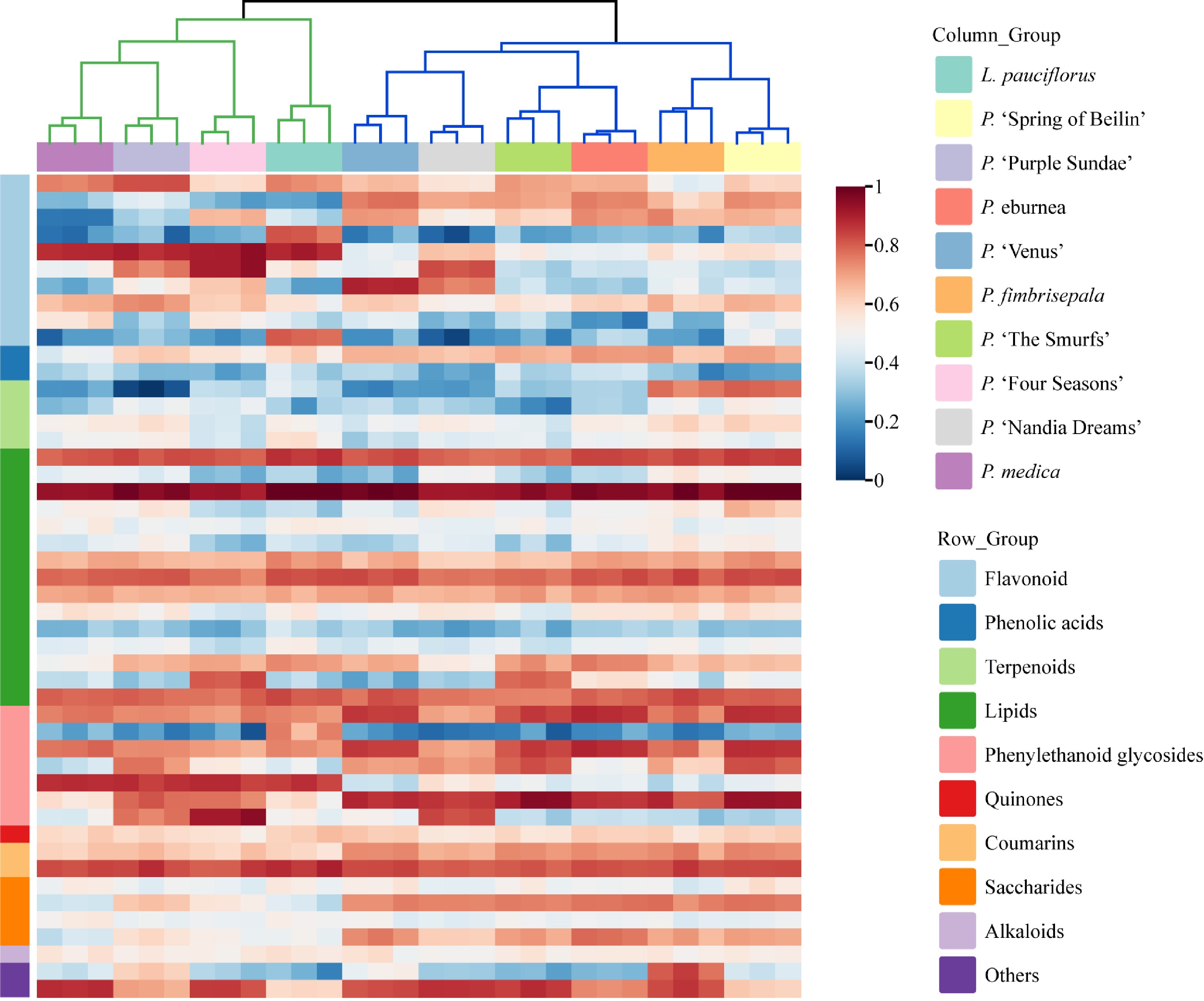Heat map analysis of metabolite clustering in the leaves of ten Gesneriaceae taxa.