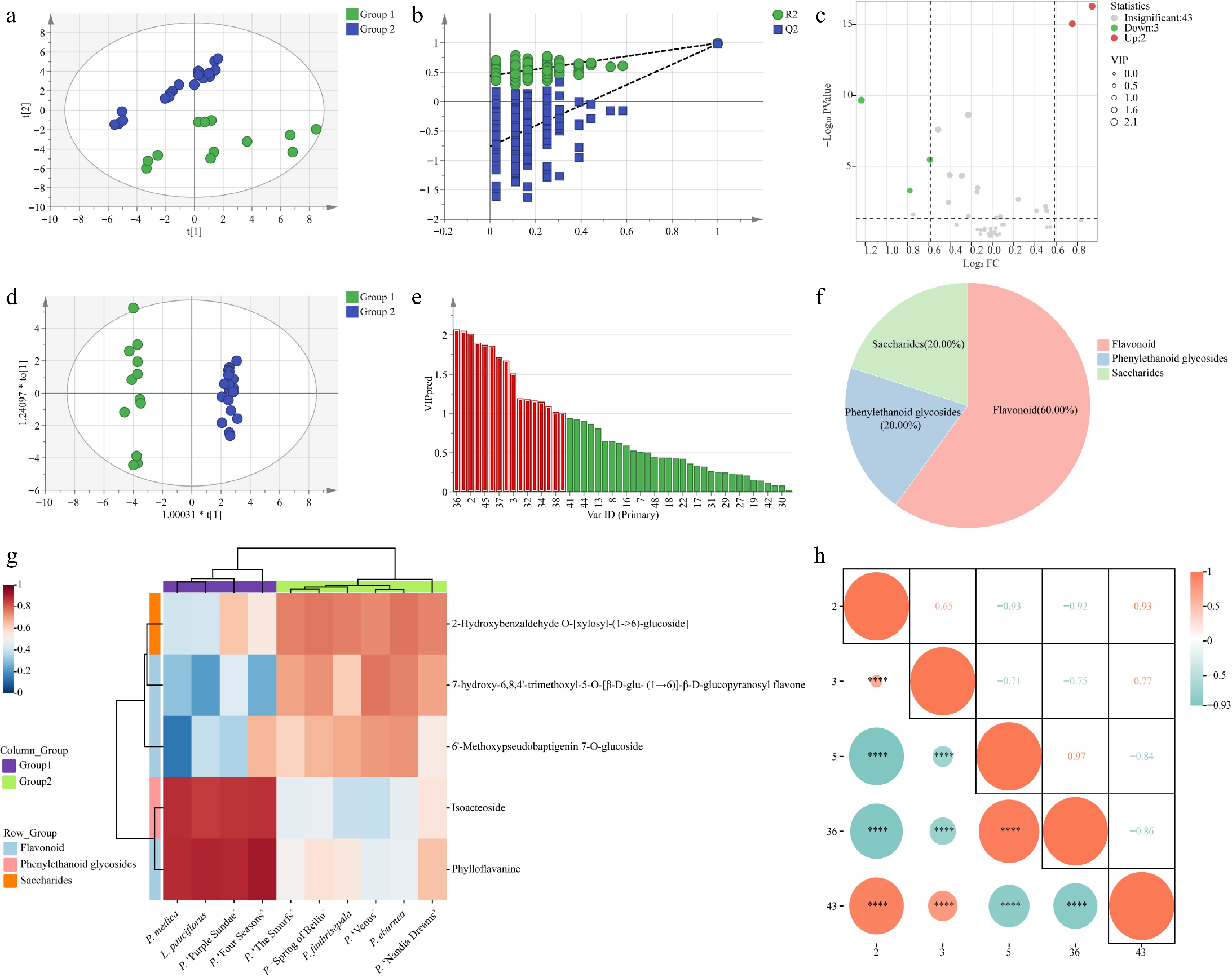 Multivariate statistical analyses of metabolites in the leaves of ten Gesneriaceae taxa. (a) Scatter plot of PCA scores. (b) Model replacement test plot. (c) Volcano diagram. (d) Scatter plot of OPLS-DA scores. (e) VIP values of metabolites. (f) DAMs pie chart. (g) DAMs clustering heat map. Group 1: P. medica, P. 'Purple Sundae,' P. 'Four Seasons', L. pauciflorus; Group 2: P. fimbrisepala, P. 'Spring of Beilin', P. 'The Smurfs', P. eburnea, P. 'Nandia Dreams', and P. 'Venus'. (h) DAMs correlation analysis. 2: 7-hydroxy-6,8,4'-trimethoxyl-5-O-[β-D-glu-(1→6)]-β-D-glucopyranosyl flavone; 3: 6'-Methoxypseudobaptigenin 7-O-glucoside; 5: Phylloflavanine; 36: Isoacteoside; 43: 2-Hydroxybenzaldehyde O-[xylosyl-(1→6)-glucoside].
