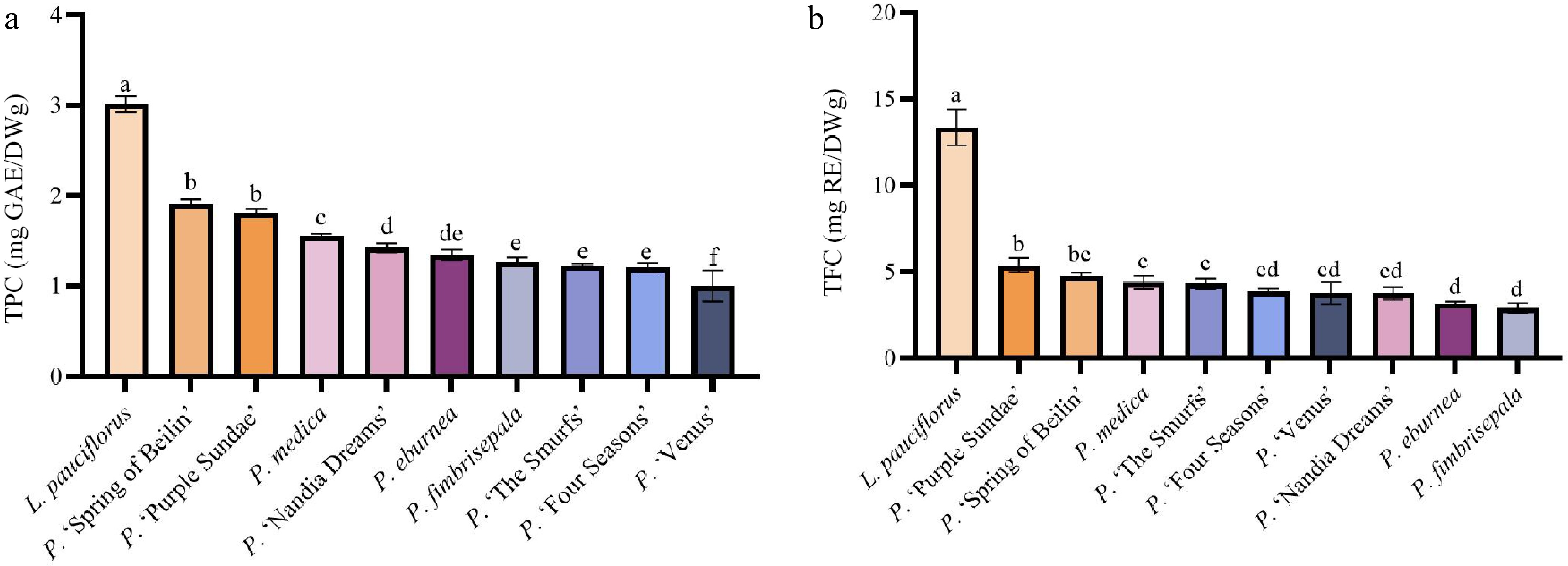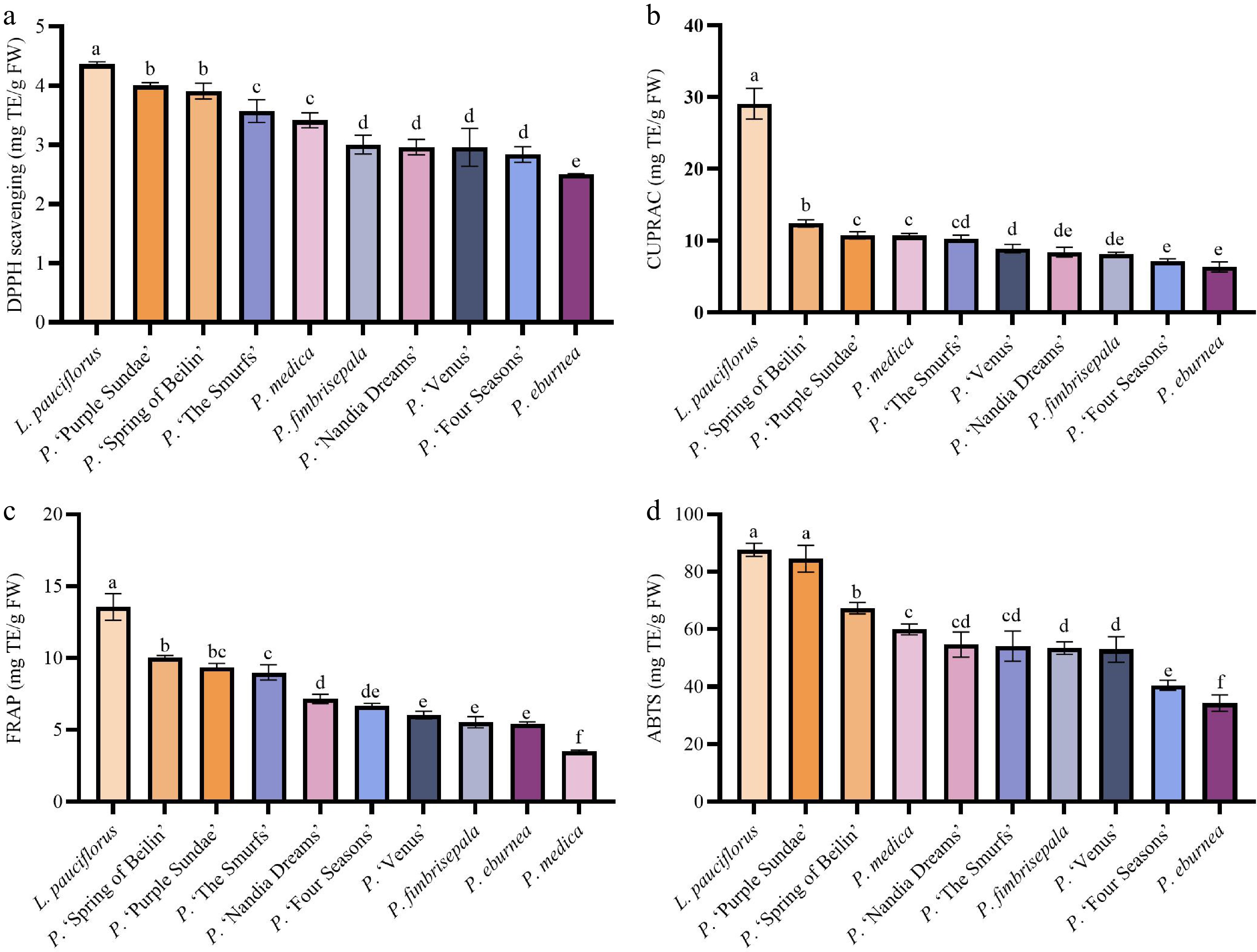 FRAP reduction activity ranged from 3.53 to 13.55 mg/g. L. pauciflorus showed the highest antioxidant activity at 13.55 mg/g, significantly higher than the other samples (p < 0.05). This was followed by P. 'Spring of Beilin' (10.03 mg/g), P. 'Purple Sundae' (9.37 mg/g), and P. 'The Smurfs' (8.99 mg/g). The lowest antioxidant activity was observed in P. medica at 3.53 mg/g.