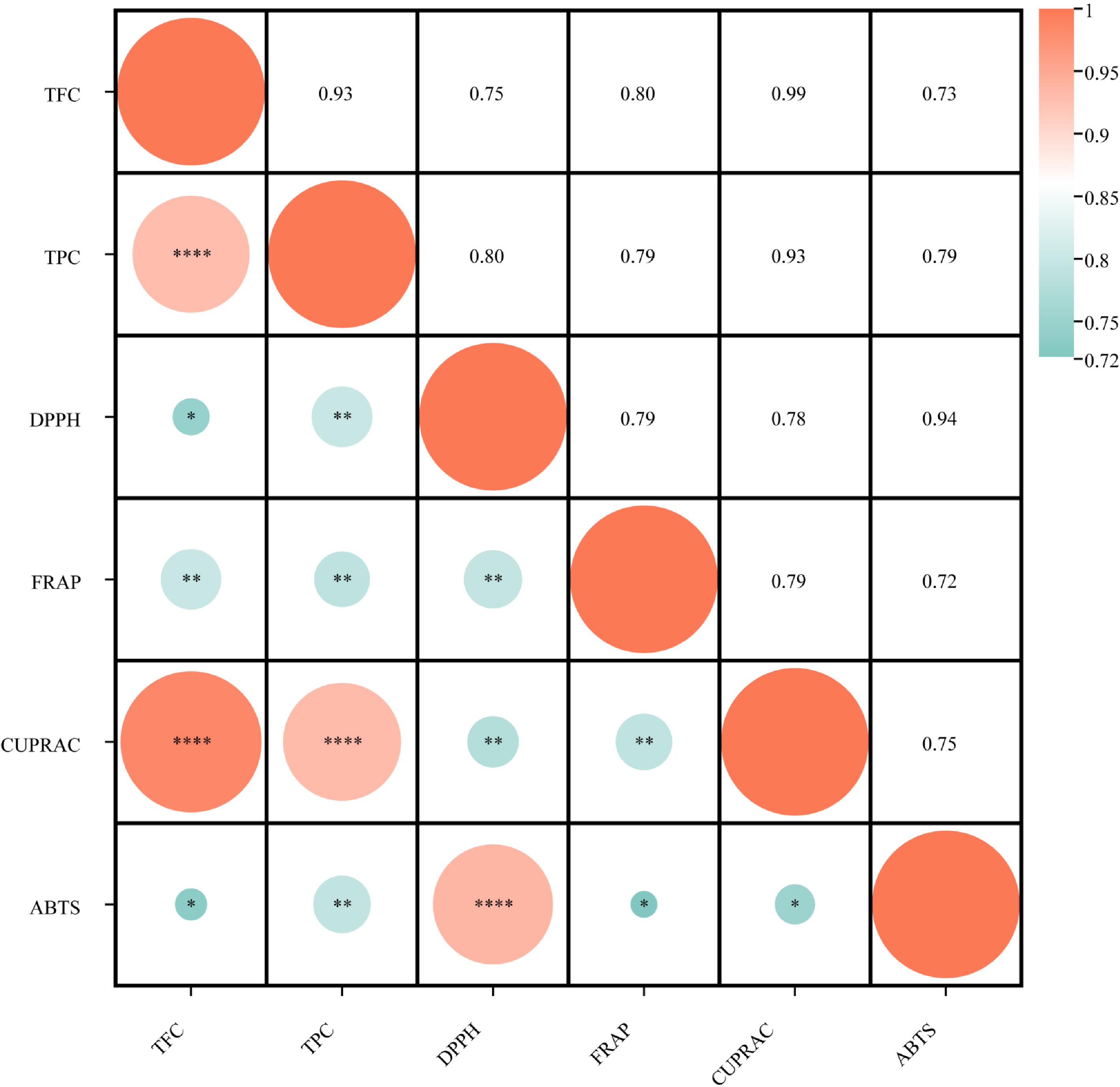 Correlation between TPC, TFC, and DPPH, ABTS, CUPRAC, and FRAP (* p < 0.05, ** p < 0.01, *** p < 0.001, and **** p < 0.0001).