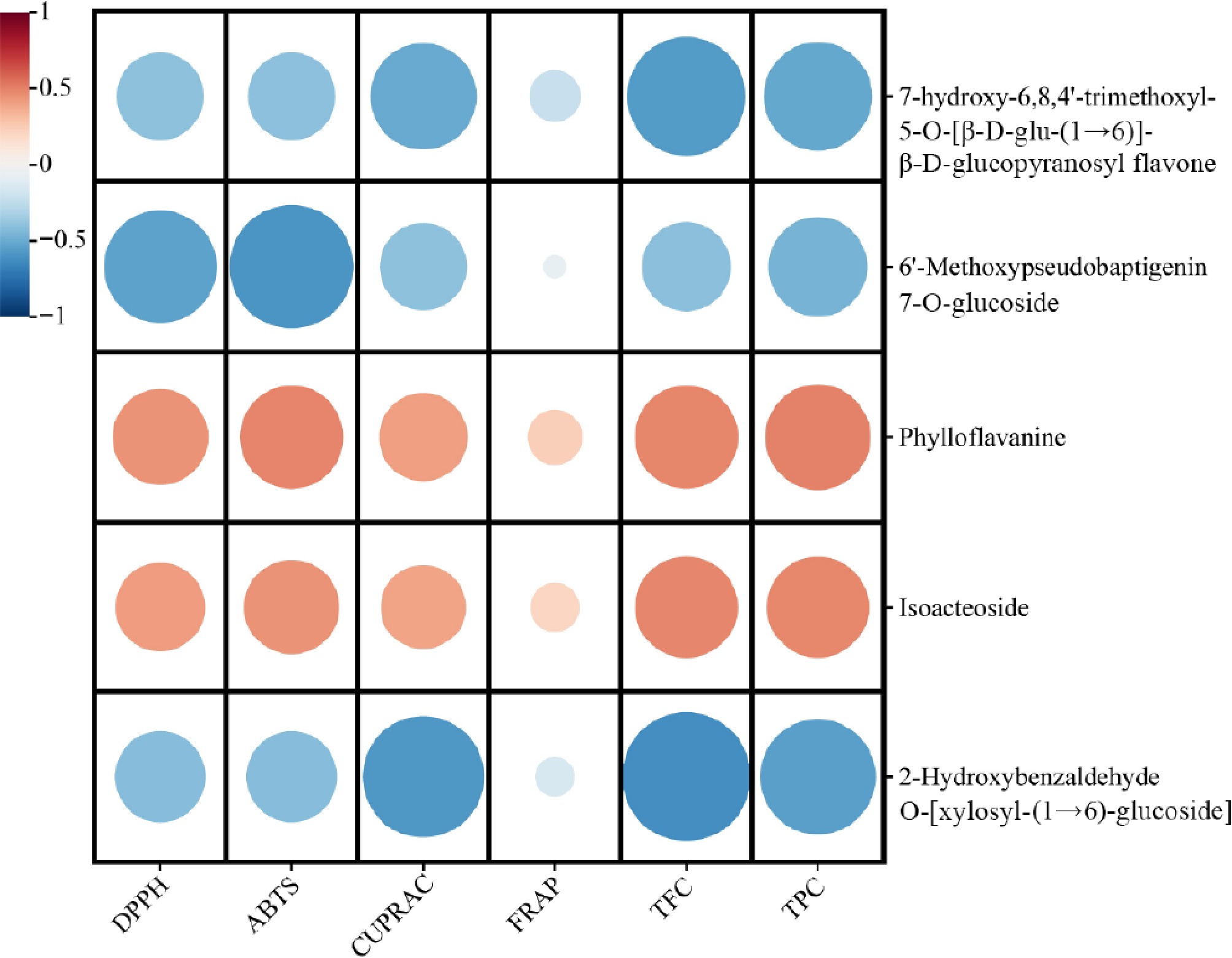 Correlation analysis of metabolites with total flavonoid content (TFC), total phenolic content (TPC), and antioxidant activity in leaves of Gesneriaceae.