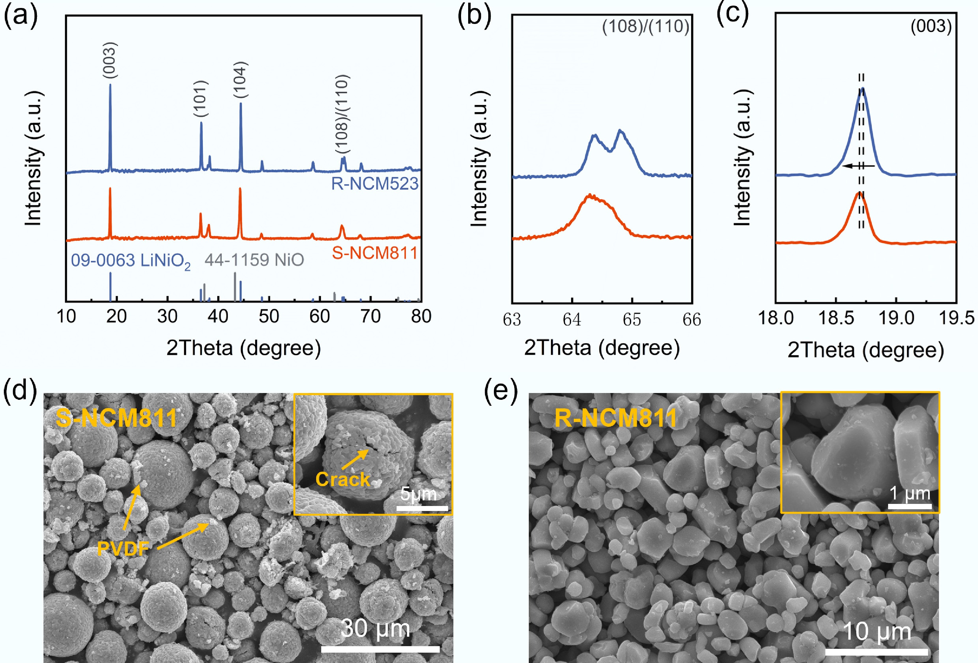 (a) XRD patterns and magnified XRD patterns of (b) (108)/(110) peaks, and (c) (003) peak for S-NCM811 and R-NCM811; (d), (e) SEM images for S-NCM811 and R-NCM811.