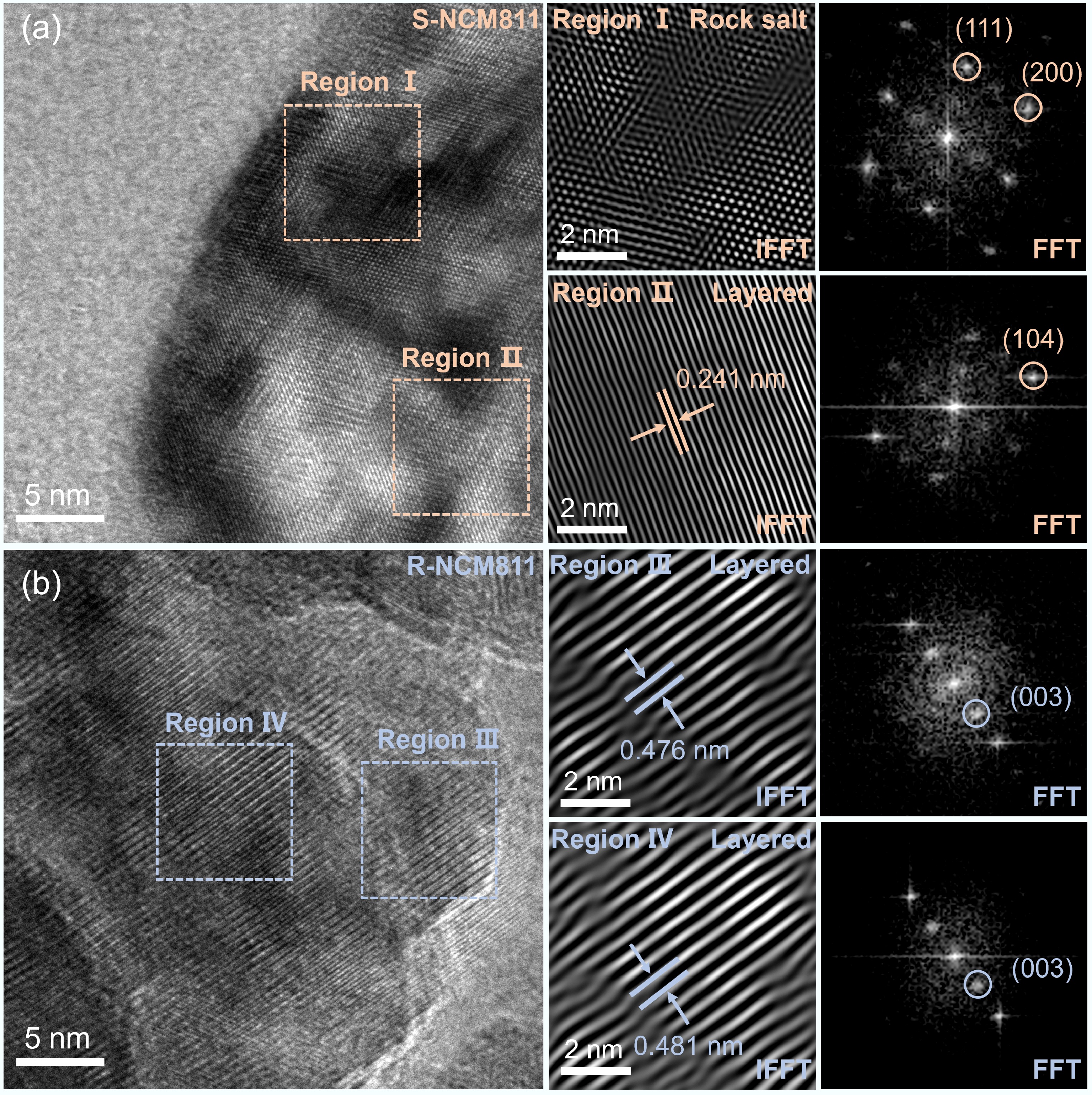 To further investigate the microstructure of the regenerated sample, HRTEM analyses were performed, as shown in Fig. 2a. In the original S-NCM811 sample, images extending from the bulk (Region II) to the outer surface (Region I) revealed the formation of a rock-salt phase structure on the surface, corresponding to the (111) and (220) planes in the FFT image. This transformation from a layered to a rock salt structure is primarily due to lithium loss and Li+/Ni2+ mixing[24,32], which corresponds to the ICP-OES results (Supplementary Table S1), inducing charge imbalance and is the core reason for the degradation of its electrochemical performance. Despite the surface structural transition, the internal structure of S-NCM811 still retained a layered arrangement, with the (104) crystal plane interlayer spacing of 0.241 nm (Region II), indicating that the structure could theoretically be restored to its original state through lithium supplementation.
