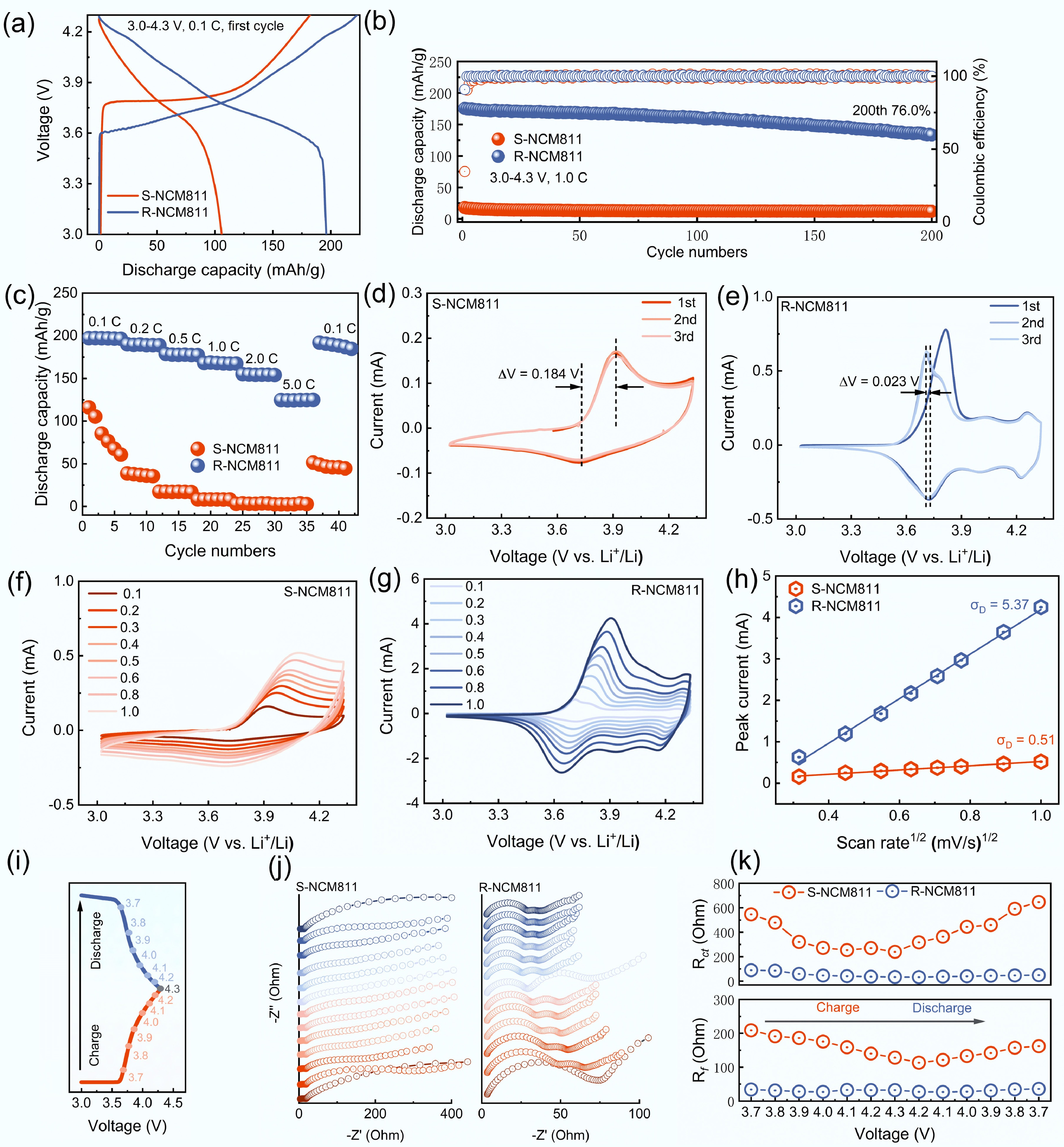 Electrochemical performance of S-NCM811 and R-NCM811: (a) Charge and discharge curves at 0.1 C. (b) Cycling performance. (c) Rate performance. (d), (e) CV curves at 0.1 mV·s−1. (f), (g) CV curves at different scan rates. (h) Linear fitting curves with various sweep speeds vs peak current. (i) Voltage profiles during in situ EIS measurement. (j), (k) In-situ Nyquist curves and resistance values for S-NCM811 and R-NCM811.