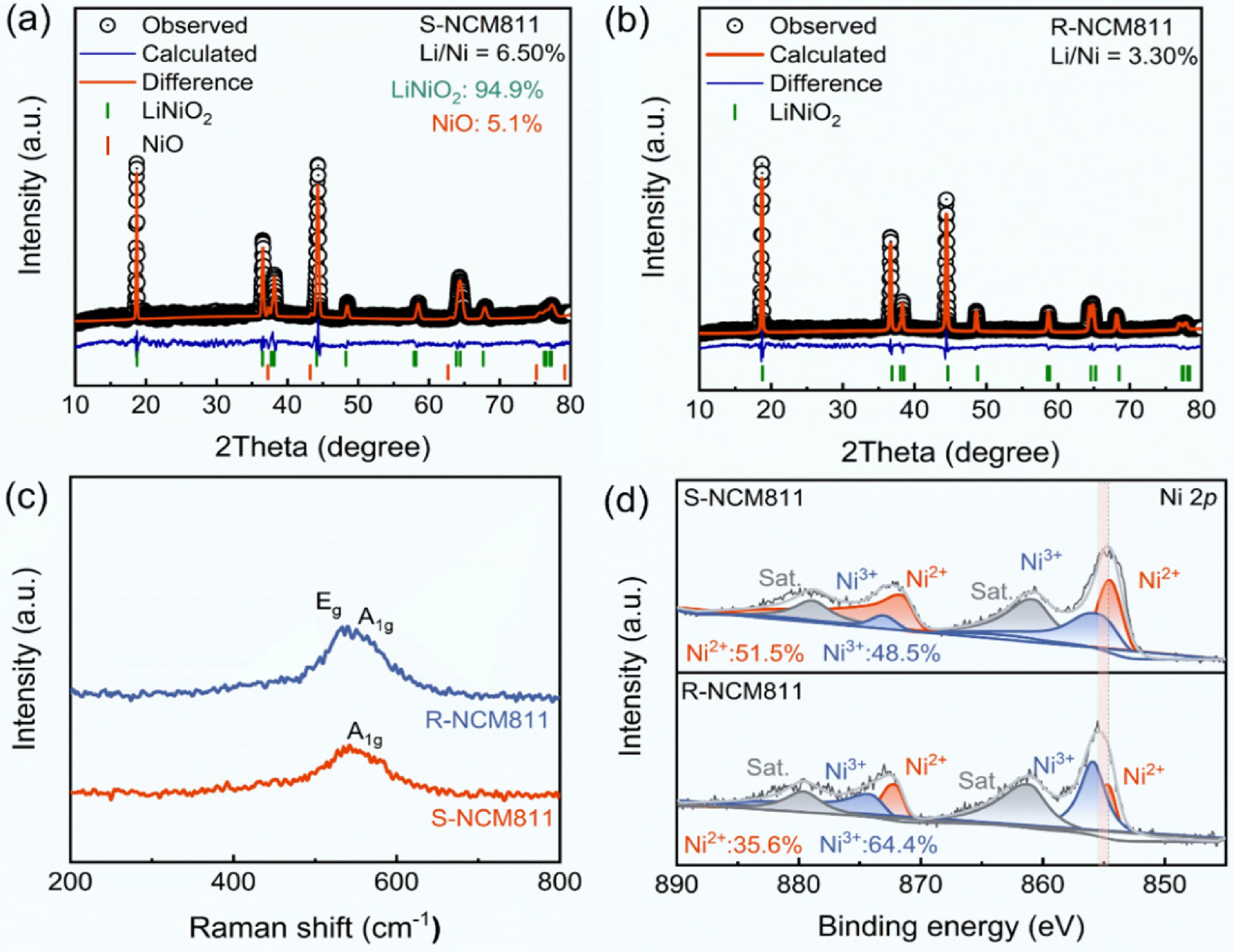 (a), (b) XRD Rietveld refinement patterns of S-NCM811 and R-NCM811. (c) Raman spectra of S-NCM811 and R-NCM811. (d) Ni 2p XPS spectra of S-NCM811 and R-NCM811.